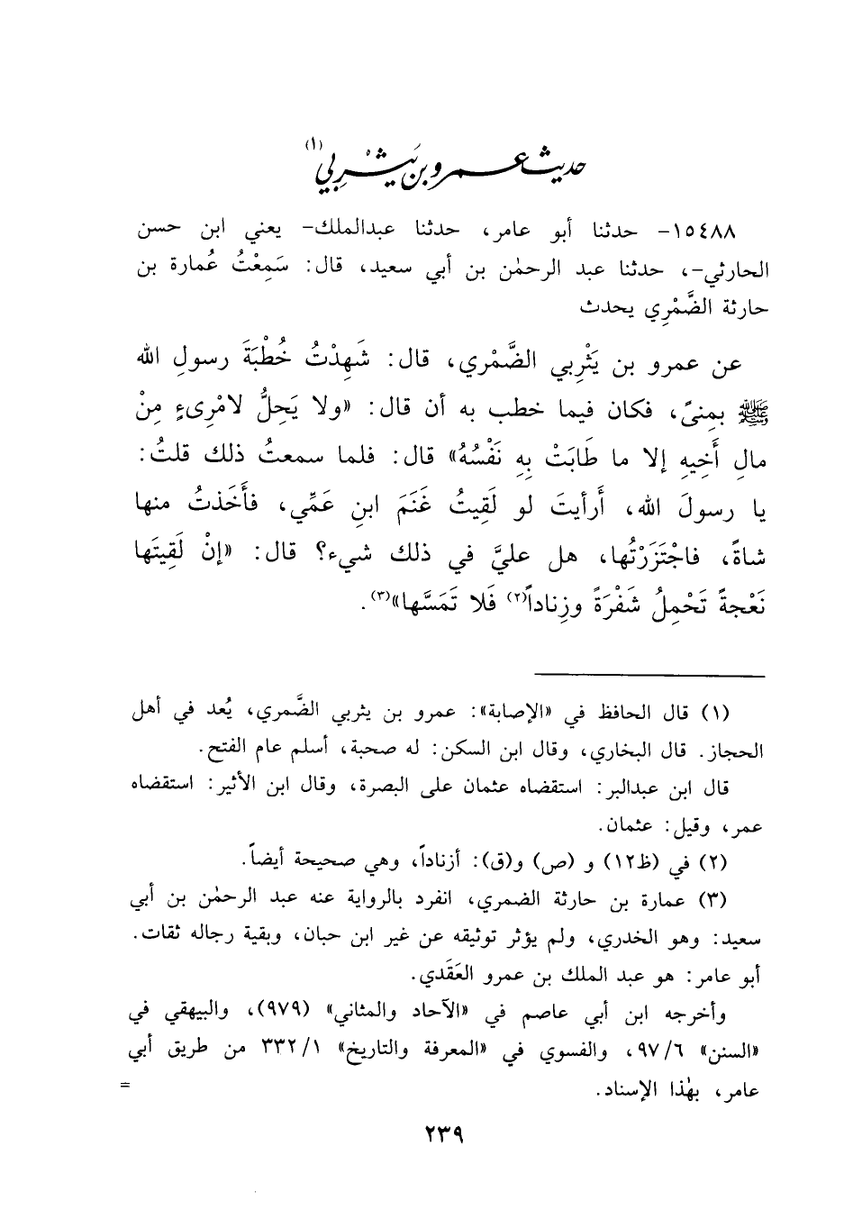 ١٥٤٨٨ - حَدَّثَنَا أَبُو عَامِرٍ، حَدَّثَنَا عَبْدُ الْمَلِكِ يَعْنِي ابْنَ حَسَنٍ الْحَارِثِيَّ، حَدَّثَنَا عَبْدُ الرَّحْمَنِ بْنُ أَبِي سَعِيدٍ، قَالَ: سَمِعْتُ عُمَارَةَ بْنَ حَارِثَةَ الضَّمْرِيَّ يُحَدِّثُ، عَنْ عَمْرِو بْنِ يَثْرِبِيٍّ الضَّمْرِيِّ، قَالَ: شَهِدْتُ خُطْبَةَ رَسُولِ اللهِ صَلَّى اللهُ عَلَيْهِ وَسَلَّمَ بِمِنًى، فَكَانَ فِيمَا خَطَبَ بِهِ أَنْ قَالَ: " وَلَا يَحِلُّ لِامْرِئٍ مِنْ مَالِ أَخِيهِ إِلَّا مَا طَابَتْ بِهِ نَفْسُهُ " قَالَ: فَلَمَّا سَمِعْتُ ذَلِكَ قُلْتُ: يَا رَسُولَ اللهِ، أَرَأَيْتَ لَوْ لَقِيتُ غَنَمَ ابْنِ عَمِّي فَأَخَذْتُ مِنْهَا شَاةً فَاجْتزََرْتُهَا؟ هَلْ عَلَيَّ فِي ذَلِكَ شَيْءٌ؟ قَالَ: " إِنْ لَقِيتَهَا نَعْجَةً تَحْمِلُ شَفْرَةً وَزِنَادًا (٢) فَلَا تَمَسَّهَا " (٣)