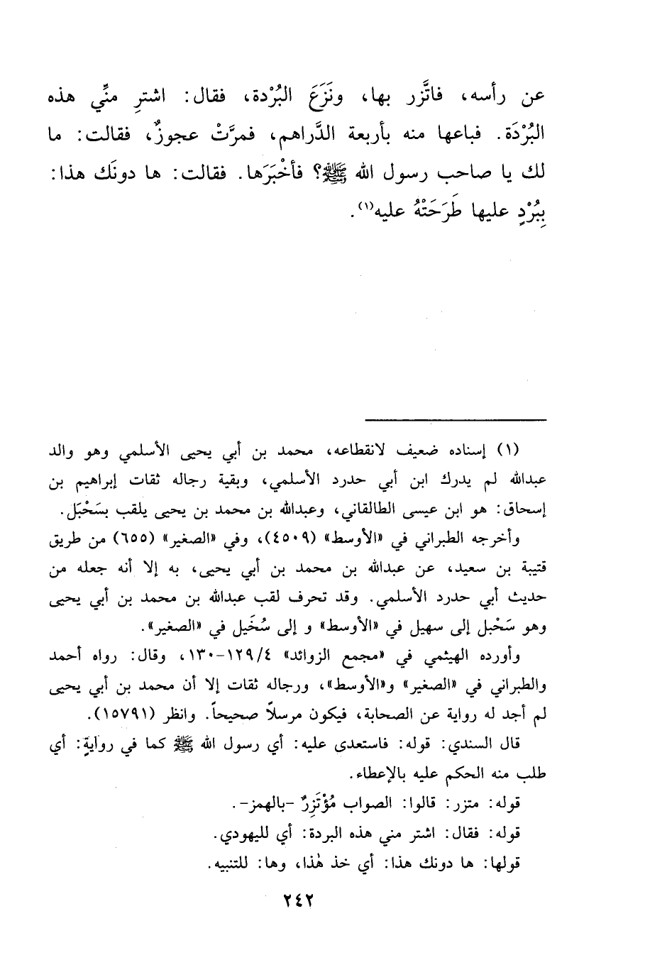 عَنْ رَأْسِهِ فَاتَّزَرَ بِهَا، وَنَزَعَ الْبُرْدَةَ، فَقَالَ: اشْتَرِ مِنِّي هَذِهِ الْبُرْدَةَ، فَبَاعَهَا مِنْهُ بِأَرْبَعَةِ الدَّرَاهِمِ، فَمَرَّتْ عَجُوزٌ فَقَالَتْ: مَا لَكَ يَا صَاحِبَ رَسُولِ اللهِ صَلَّى اللهُ عَلَيْهِ وَسَلَّمَ؟ فَأَخْبَرَهَا فَقَالَتْ: هَا دُونَكَ هَذَا: بِبُرْدٍ عَلَيْهَا طَرَحَتْهُ عَلَيْهِ (١)