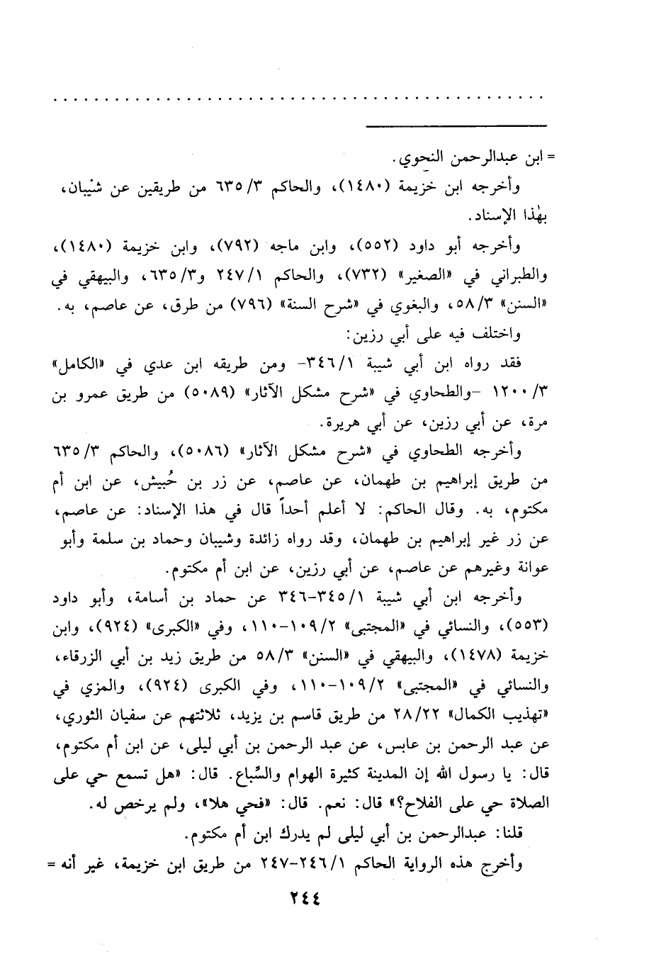 وأخرجه الطحاوي في "شرح مشكل الآثار" (٥٠٨٦) ، والحاكم ٣/٦٣٥ من طريق إبراهيم بن طهمان، عن عاصم، عن زر بن حُبيش، عن ابن أم مكتوم، به. وقال الحاكم: لا أعلم أحداً قال في هذا الإسناد: عن عاصم، عن زر غير إبراهيم بن طهمان، وقد رواه زائدة وشيبان وحماد بن سلمة وأبو عوانة وغيرهم عن عاصم، عن أبي رزين، عن ابن أم مكتوم.