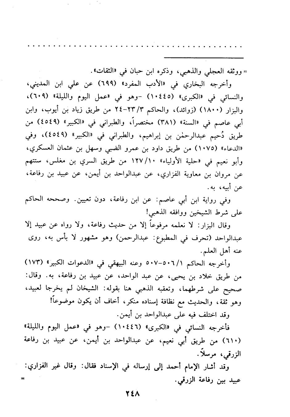 وقال البزار: لا نعلمه مرفوعاً إلا من حديث رفاعة، ولا رواه عن عبيد إلا عبد الواحد (تحرف في المطبوع: عبد الرحمن) وهو مشهور لا بأس به، روى عنه أهل العلم.