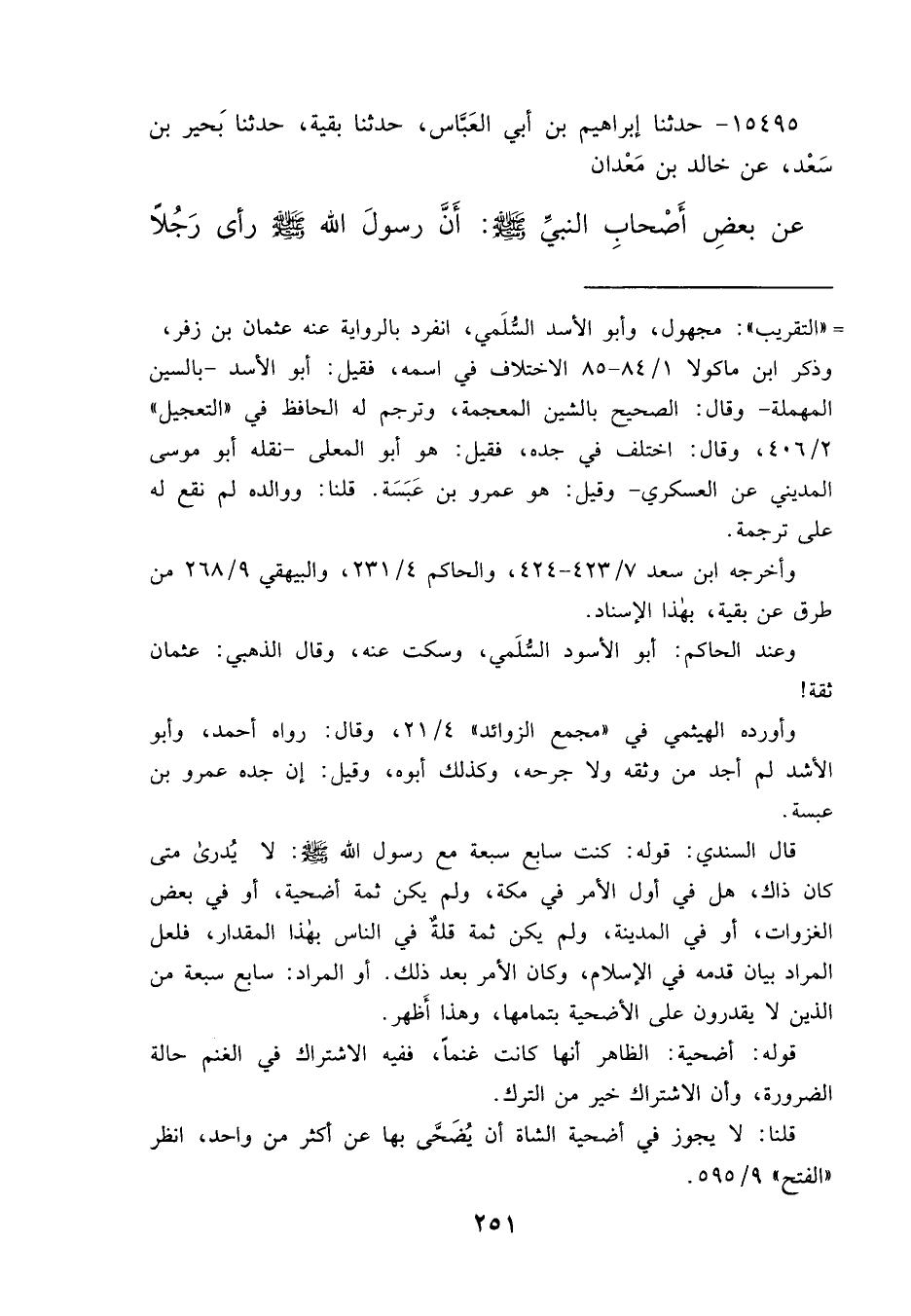 ١٥٤٩٥ - حَدَّثَنَا إِبْرَاهِيمُ بْنُ أَبِي الْعَبَّاسِ، حَدَّثَنَا بَقِيَّةُ، حَدَّثَنَا بَحِيرُ بْنُ سَعْدٍ، عَنْ خَالِدِ بْنِ مَعْدَانَ، عَنْ بَعْضِ أَصْحَابِ النَّبِيِّ صَلَّى اللهُ عَلَيْهِ وَسَلَّمَ: أَنَّ رَسُولَ اللهِ صَلَّى اللهُ عَلَيْهِ وَسَلَّمَ رَأَى رَجُلًا