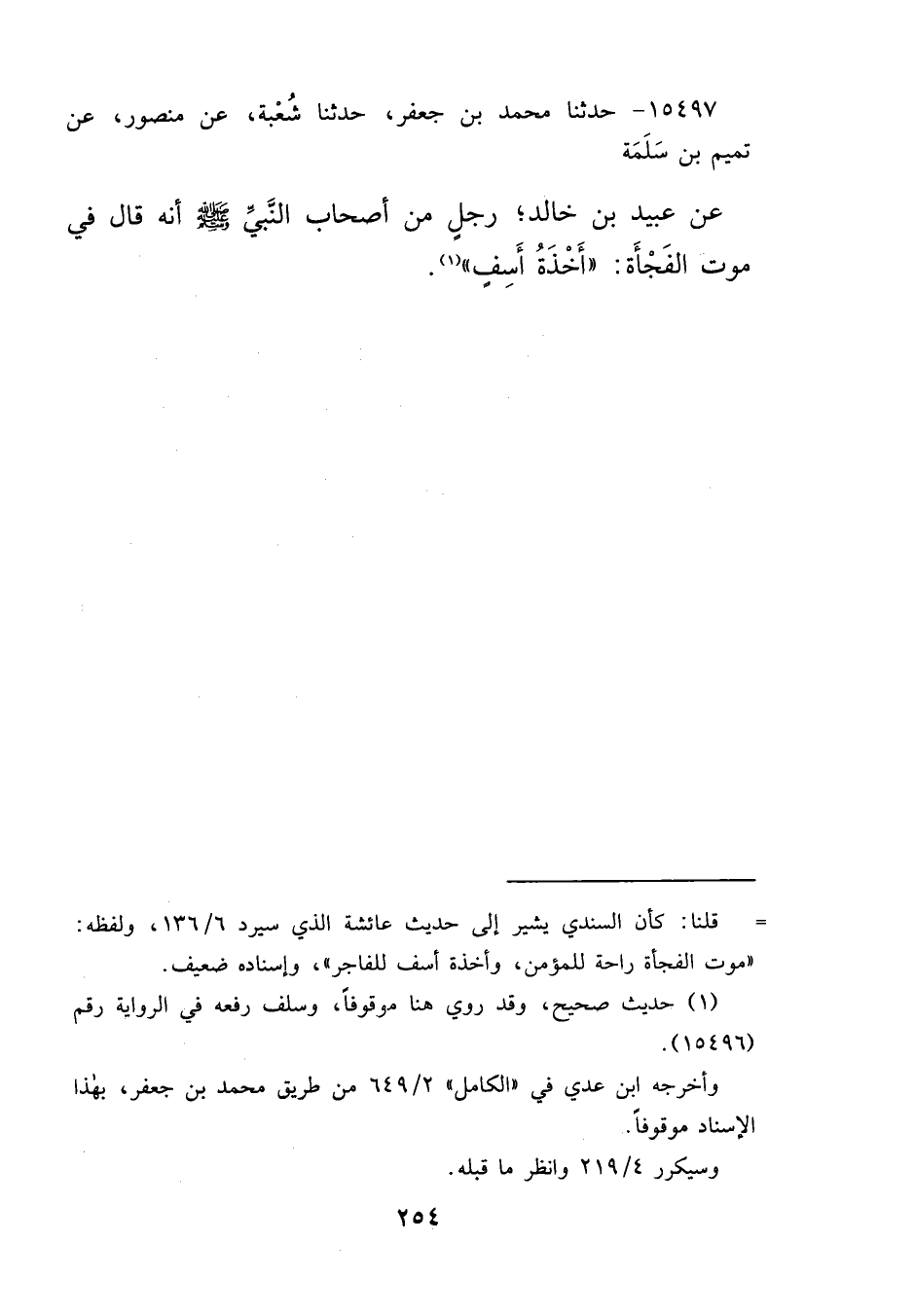 ١٥٤٩٧ - حَدَّثَنَا مُحَمَّدُ بْنُ جَعْفَرٍ، حَدَّثَنَا شُعْبَةُ، عَنْ مَنْصُورٍ، عَنْ تَمِيمِ بْنِ سَلَمَةَ، عَنْ عُبَيْدِ بْنِ خَالِدٍ، رَجُلٍ مِنْ أَصْحَابِ النَّبِيِّ صَلَّى اللهُ عَلَيْهِ وَسَلَّمَ، أَنَّهُ قَالَ فِي مَوْتِ الْفَجْأَةِ: " أَخْذَةُ أَسَفٍ " (١)