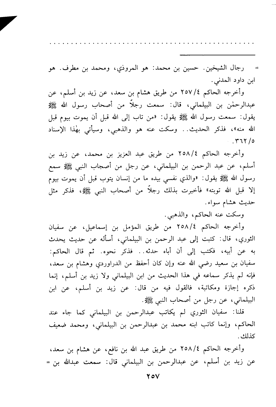 وأخرجه الحاكم ٤/٢٥٨ من طريق عبد الله بن نافع، عن هشام بن سعد، عن زيد بن إسلم، عن عبد الرحمن بن البيلماني قال: سمعت عبد الله بن =
