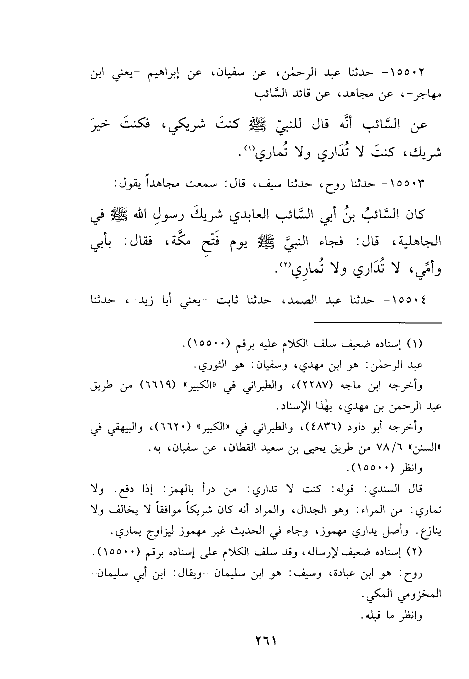 ١٥٥٠٢ - حَدَّثَنَا عَبْدُ الرَّحْمَنِ بْنُ مَهْدِيٍّ، عَنْ سُفْيَانَ، عَنْ إِبْرَاهِيمَ يَعْنِي ابْنَ مُهَاجِرٍ، عَنْ مُجَاهِدٍ، عَنْ قَائِدِ السَّائِبِ، عَنِ السَّائِبِ، أَنَّهُ قَالَ لِلنَّبِيِّ صَلَّى اللهُ عَلَيْهِ وَسَلَّمَ: " كُنْتَ شَرِيكِي فَكُنْتَ خَيْرَ شَرِيكٍ، كُنْتَ لَا تُدَارِي، وَلَا تُمَارِي " (١)