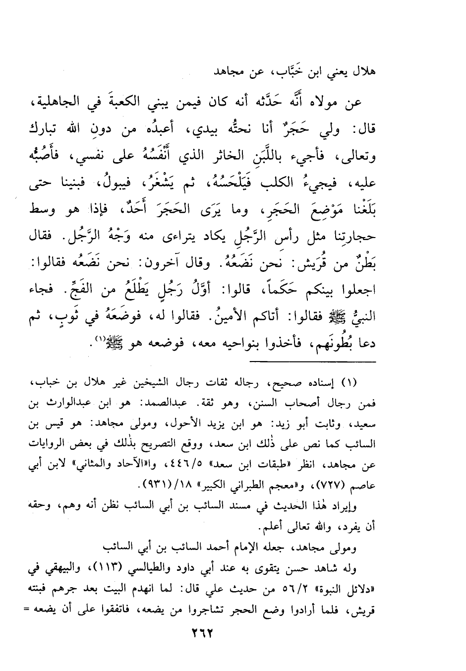 هِلَالٌ يَعْنِي ابْنَ خَبَّابٍ، عَنْ مُجَاهِدٍ، عَنْ مَوْلَاهُ أَنَّهُ حَدَّثَهُ، أَنَّهُ كَانَ فِيمَنْ يَبْنِي الْكَعْبَةَ فِي الْجَاهِلِيَّةِ؟ قَالَ: وَلِي حَجَرٌ أَنَا نَحَتُّهُ بِيَدَيَّ أَعْبُدُهُ مِنْ دُونِ اللهِ تَبَارَكَ وَتَعَالَى، فَأَجِيءُ بِاللَّبَنِ الْخَاثِرِ الَّذِي أَنْفَسُهُ عَلَى نَفْسِي، فَأَصُبُّهُ عَلَيْهِ، فَيَجِيءُ الْكَلْبُ فَيَلْحَسُهُ، ثُمَّ يَشْغَرُ فَيَبُولُ فَبَنَيْنَا حَتَّى بَلَغْنَا مَوْضِعَ الْحَجَرِ، وَمَا يَرَى الْحَجَرَ أَحَدٌ، فَإِذَا هُوَ وَسْطَ حِجَارَتِنَا مِثْلَ رَأْسِ الرَّجُلِ يَكَادُ يَتَرَاءَى مِنْهُ، وَجْهُ الرَّجُلِ فَقَالَ: بَطْنٌ مِنْ قُرَيْشٍ نَحْنُ نَضَعُهُ، وَقَالَ: آخَرُونَ نَحْنُ نَضَعُهُ، فَقَالُوا: اجْعَلُوا بَيْنَكُمْ حَكَمًا، قَالُوا: أَوَّلَ رَجُلٍ يَطْلُعُ مِنَ الْفَجِّ، فَجَاءَ النَّبِيُّ صَلَّى اللهُ عَلَيْهِ وَسَلَّمَ فَقَالُوا: أَتَاكُمُ الْأَمِينُ، فَقَالُوا لَهُ، " فَوَضَعَهُ فِي ثَوْبٍ، ثُمَّ دَعَا بُطُونَهُمْ فَأَخَذُوا بِنَوَاحِيهِ مَعَهُ، فَوَضَعَهُ هُوَ صَلَّى اللهُ عَلَيْهِ وَسَلَّمَ " (١)