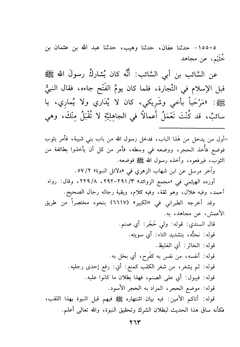 ١٥٥٠٥ - حَدَّثَنَا عَفَّانُ، حَدَّثَنَا وُهَيْبٌ، حَدَّثَنَا عَبْدُ اللهِ بْنُ عُثْمَانَ بْنِ خُثَيْمٍ، عَنْ مُجَاهِدٍ، عَنِ السَّائِبِ بْنِ أَبِي السَّائِبِ، أَنَّهُ كَانَ يُشَارِكُ رَسُولَ اللهِ صَلَّى اللهُ عَلَيْهِ وَسَلَّمَ قَبْلَ الْإِسْلَامِ فِي التِّجَارَةِ، فَلَمَّا كَانَ يَوْمُ الْفَتْحِ جَاءَهُ، فَقَالَ النَّبِيُّ صَلَّى اللهُ عَلَيْهِ وَسَلَّمَ: " مَرْحَبًا بِأَخِي، وَشَرِيكِي كَانَ لَا يُدَارِي، وَلَا يُمَارِي، يَا سَائِبُ قَدْ كُنْتَ تَعْمَلُ أَعْمَالًا فِي الْجَاهِلِيَّةِ، لَا تُقْبَلُ مِنْكَ، وَهِيَ