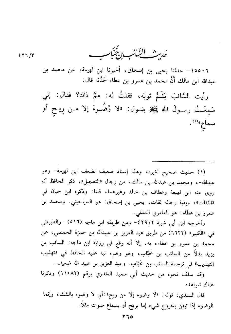 ١٥٥٠٦ - حَدَّثَنَا يَحْيَى بْنُ إِسْحَاقَ، أَخْبَرَنَا ابْنُ لَهِيعَةَ، عَنْ مُحَمَّدِ بْنِ عَبْدِ اللهِ بْنِ مَالِكٍ، أَنَّ مُحَمَّدَ بْنَ عَمْرِو بْنِ عَطَاءٍ حَدَّثَهُ، قَالَ: رَأَيْتُ السَّائِبَ يَشُمُّ ثَوْبَهُ، فَقُلْتُ لَهُ: مِمَّ ذَاكَ؟ فَقَالَ: إِنِّي سَمِعْتُ رَسُولَ اللهِ صَلَّى اللهُ عَلَيْهِ وَسَلَّمَ يَقُولُ: " لَا وُضُوءَ إِلَّا مِنْ رِيحٍ أَوْ سَمَاعٍ " (١)