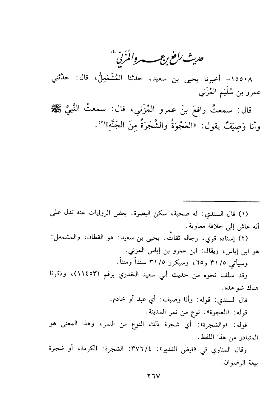 ١٥٥٠٨ - أَخْبَرَنَا يَحْيَى بْنُ سَعِيدٍ، حَدَّثَنَا الْمُشْمَعِلُّ، قَالَ: حَدَّثَنِي عَمْرُو بْنُ سُلَيْمٍ الْمُزَنِيُّ، قَالَ: سَمِعْتُ رَافِعَ بْنَ عَمْرٍو الْمُزَنِيَّ، قَالَ: سَمِعْتُ النَّبِيَّ صَلَّى اللهُ عَلَيْهِ وَسَلَّمَ وَأَنَا وَصِيفٌ يَقُولُ: " الْعَجْوَةُ وَالشَّجَرَةُ مِنَ الْجَنَّةِ " (٢)