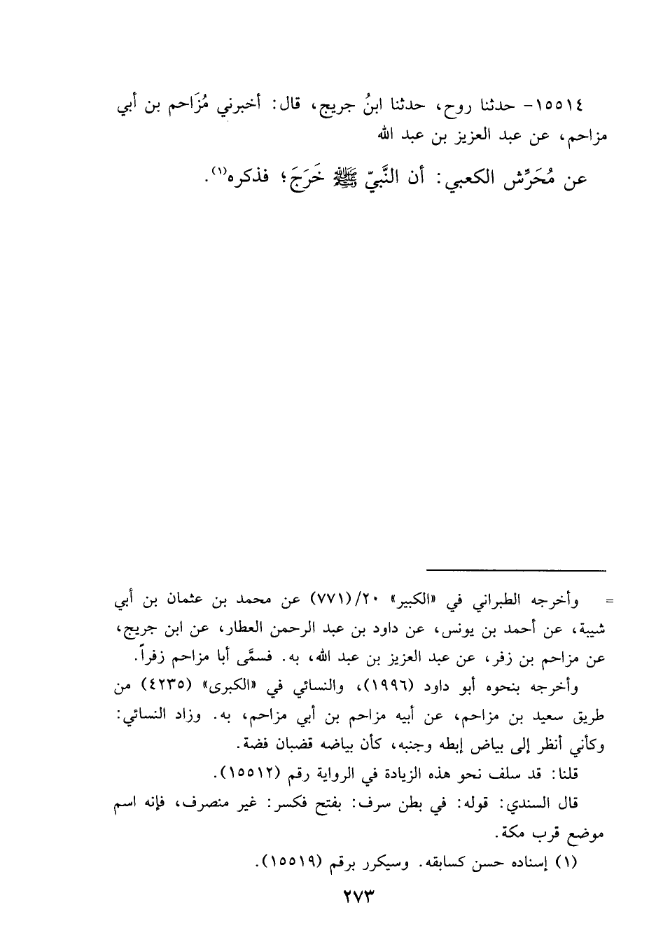 ١٥٥١٤ - حَدَّثَنَا رَوْحٌ، حَدَّثَنَا ابْنُ جُرَيْجٍ، قَالَ: أَخْبَرَنِي مُزَاحِمُ بْنُ أَبِي مُزَاحِمٍ، عَنْ عَبْدِ الْعَزِيزِ بْنِ عَبْدِ اللهِ، عَنْ مُحَرِّشٍ الْكَعْبِيِّ، أَنَّ النَّبِيَّ صَلَّى اللهُ عَلَيْهِ وَسَلَّمَ خَرَجَ، فَذَكَرَهُ (١)