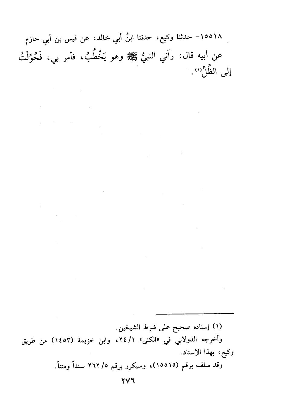 ١٥٥١٨ - حَدَّثَنَا وَكِيعٌ، حَدَّثَنَا ابْنُ أَبِي خَالِدٍ، عَنْ قَيْسِ بْنِ أَبِي حَازِمٍ، عَنْ أَبِيهِ، قَالَ: " رَآنِي النَّبِيُّ صَلَّى اللهُ عَلَيْهِ وَسَلَّمَ وَهُوَ يَخْطُبُ فَأَمَرَ بِي فَحُوِّلْتُ إِلَى الظِّلِّ " (١)