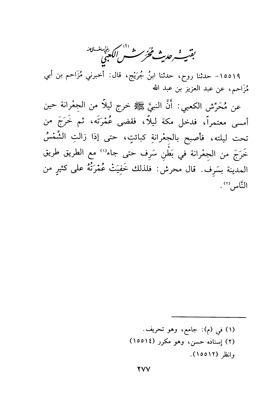 ١٥٥١٩ - حَدَّثَنَا رَوْحٌ، حَدَّثَنَا ابْنُ جُرَيْجٍ، قَالَ: أَخْبَرَنِي مُزَاحِمُ بْنُ أَبِي مُزَاحِمٍ، عَنْ عَبْدِ الْعَزِيزِ بْنِ عَبْدِ اللهِ، عَنْ مُحَرِّشٍ الْكَعْبِيِّ، " أَنَّ النَّبِيَّ صَلَّى اللهُ عَلَيْهِ وَسَلَّمَ خَرَجَ لَيْلًا مِنَ الْجِعْرَانَةِ حِينَ أَمْسَى مُعْتَمِرًا، فَدَخَلَ مَكَّةَ لَيْلًا فَقَضَى عُمْرَتَهُ، ثُمَّ خَرَجَ مِنْ تَحْتِ لَيْلَتِهِ، فَأَصْبَحَ بِالْجِعْرَانَةِ كَبَائِتٍ حَتَّى، إِذَا زَالَتِ الشَّمْسُ خَرَجَ مِنَ الْجِعْرَانَةِ فِي بَطْنِ سَرِفَ، حَتَّى جَاءَ مَعَ الطَّرِيقُ طَرِيقَ الْمَدِينَةِ بِسَرِفَ " قَالَ مُحَرِّشٌ: فَلِذَلِكَ خَفِيَتْ عُمْرَتُهُ عَلَى كَثِيرٍ مِنَ النَّاسِ (٢)