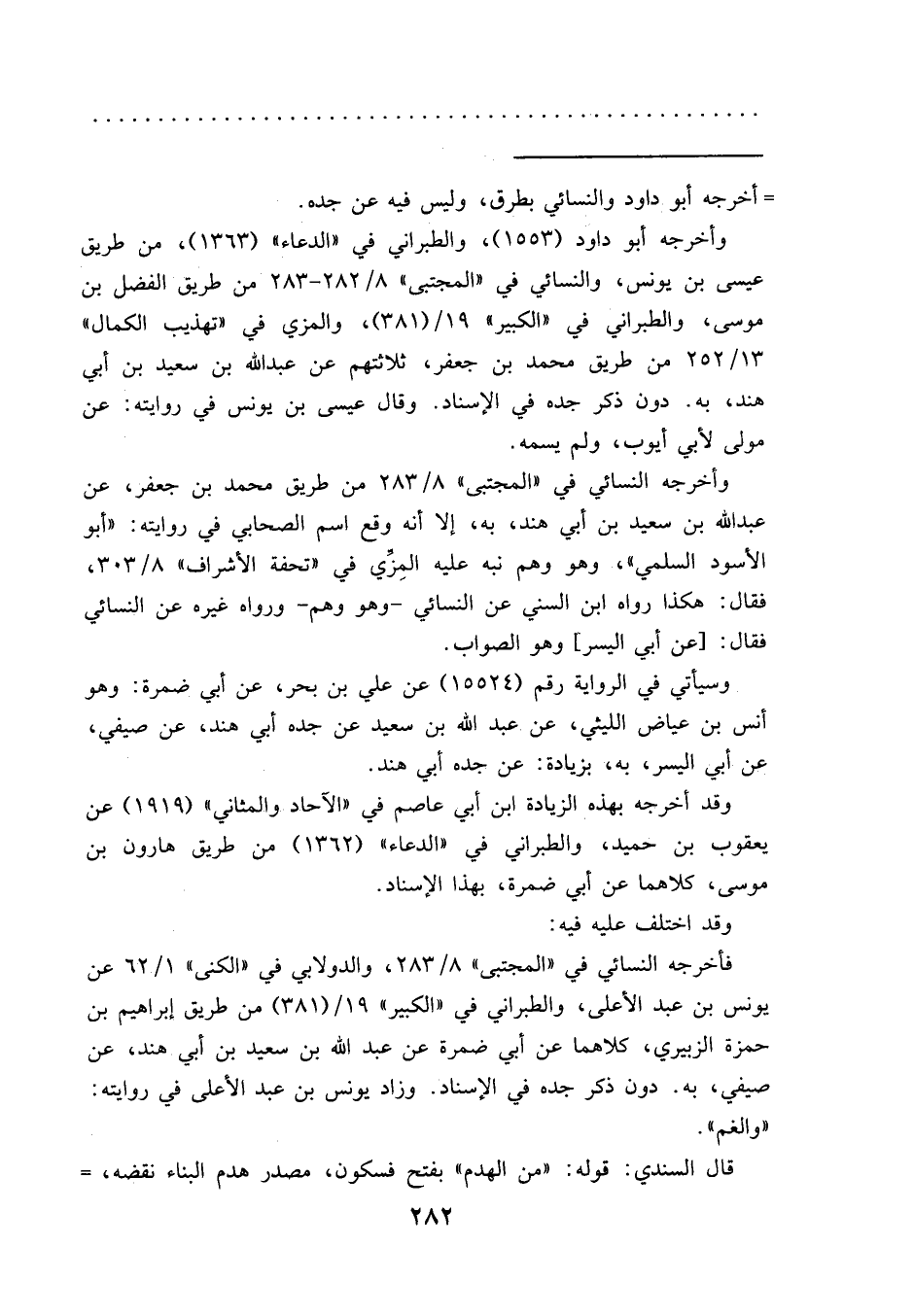 وسيأتي في الرواية رقم (١٥٥٢٤) عن علي بن بحر، عن أبي ضمرة: وهو أنس بن عياض الليثي، عن عبد الله بن سعيد عن جده أبي هند، عن صيفى، عن أبي اليسر، به، بزيادة: عن جده أبي هند.