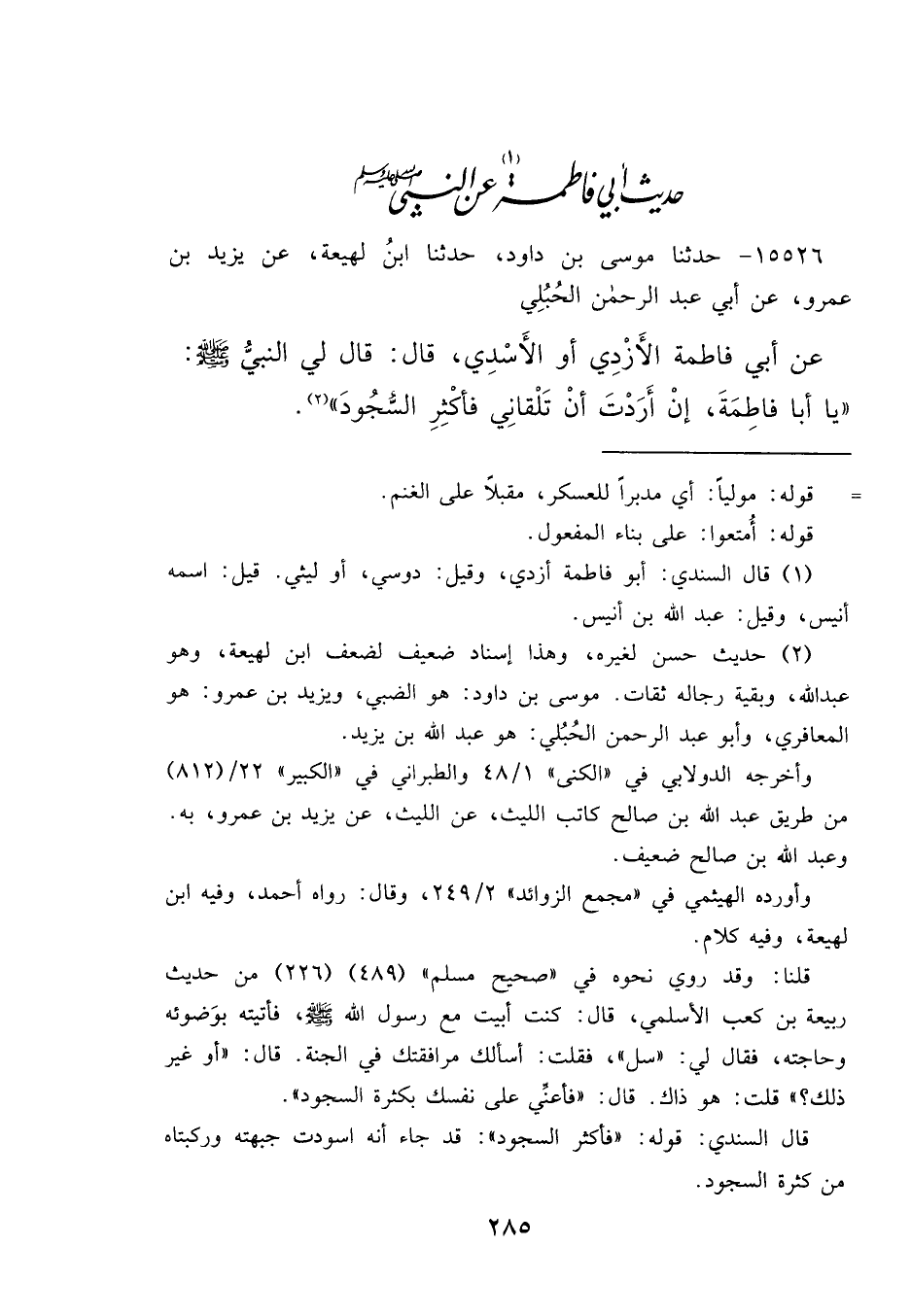 ١٥٥٢٦ - حَدَّثَنَا مُوسَى بْنُ دَاوُدَ، حَدَّثَنَا ابْنُ لَهِيعَةَ، عَنْ يَزِيدَ بْنِ عَمْرٍو، عَنْ أَبِي عَبْدِ الرَّحْمَنِ الْحُبُلِيِّ، عَنْ أَبِي فَاطِمَةَ الْأَزْدِيِّ، أَوِ الْأَسَدِيِّ، قَالَ: قَالَ لِي النَّبِيُّ صَلَّى اللهُ عَلَيْهِ وَسَلَّمَ: " يَا أَبَا فَاطِمَةَ، إِنْ أَرَدْتَ أَنْ تَلْقَانِي فَأَكْثِرِ السُّجُودَ " (٢)