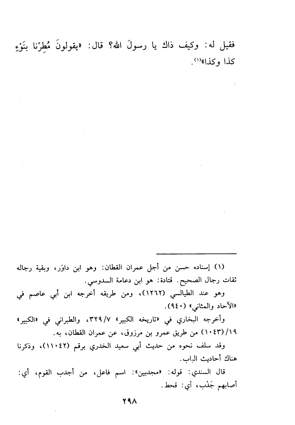 فَقِيلَ لَهُ: وَكَيْفَ ذَاكَ يَا رَسُولَ اللهِ؟ قَالَ: " يَقُولُونَ مُطِرْنَا بِنَوْءِ كَذَا وَكَذَا " (١)