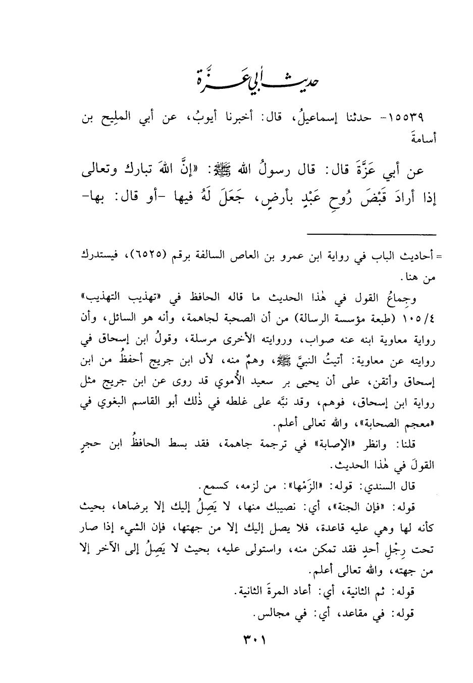 ١٥٥٣٩ - حَدَّثَنَا إِسْمَاعِيلُ، قَالَ: أَخْبَرَنَا أَيُّوبُ، عَنْ أَبِي الْمَلِيحِ بْنِ أُسَامَةَ، عَنْ أَبِي عَزَّةَ، قَالَ: قَالَ رَسُولُ اللهِ صَلَّى اللهُ عَلَيْهِ وَسَلَّمَ: " إِنَّ اللهَ تَبَارَكَ وَتَعَالَى إِذَا أَرَادَ قَبْضَ رُوحِ عَبْدٍ بِأَرْضٍ، جَعَلَ لَهُ فِيهَا - أَوْ قَالَ: بِهَا