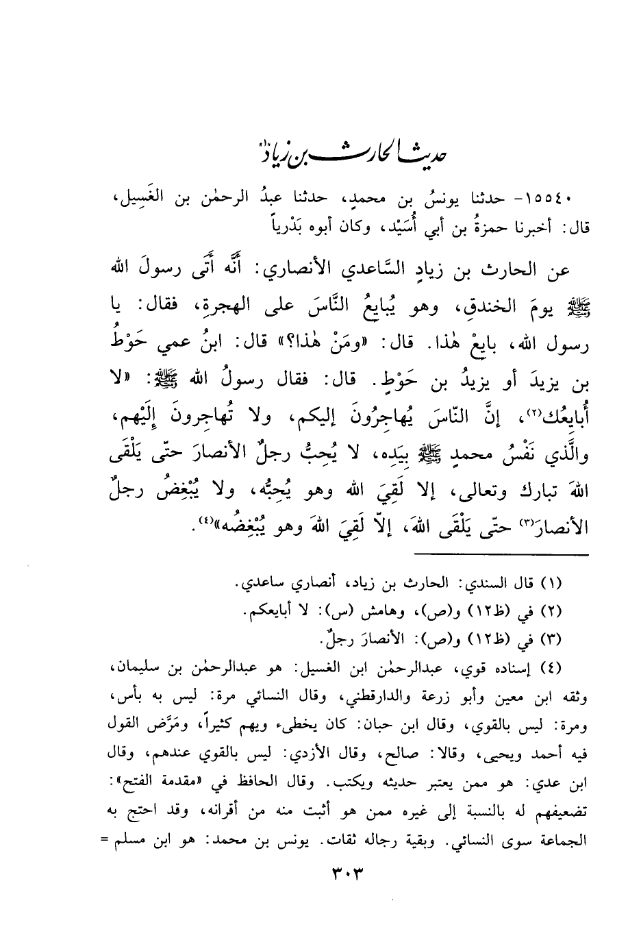 ١٥٥٤٠ - حَدَّثَنَا يُونُسُ بْنُ مُحَمَّدٍ، حَدَّثَنَا عَبْدُ الرَّحْمَنِ بْنُ الْغَسِيلِ، قَالَ: أَخْبَرَنَا حَمْزَةُ بْنُ أَبِي أُسَيْدٍ، وَكَانَ أَبُوهُ بَدْرِيًّا، عَنِ الْحَارِثِ بْنِ زِيَادٍ السَّاعِدِيِّ الْأَنْصَارِيِّ، أَنَّهُ أَتَى رَسُولَ اللهِ صَلَّى اللهُ عَلَيْهِ وَسَلَّمَ يَوْمَ الْخَنْدَقِ، وَهُوَ يُبَايِعُ النَّاسَ عَلَى الْهِجْرَةِ، فَقَالَ: يَا رَسُولَ اللهِ، بَايِعْ هَذَا؟ قَالَ: " وَمَنْ هَذَا؟ " قَالَ: ابْنُ عَمِّي حَوْطُ بْنُ يَزِيدَ - أَوْ يَزِيدُ بْنُ حَوْطٍ - قَالَ: فَقَالَ رَسُولُ اللهِ صَلَّى اللهُ عَلَيْهِ وَسَلَّمَ: " لَا أُبَايِعُكَ (٢) ، إِنَّ النَّاسَ يُهَاجِرُونَ إِلَيْكُمْ، وَلَا تُهَاجِرُونَ إِلَيْهِمْ، وَالَّذِي نَفْسُ مُحَمَّدٍ صَلَّى اللهُ عَلَيْهِ وَسَلَّمَ بِيَدِهِ، لَا يُحِبُّ رَجُلٌ الْأَنْصَارَ حَتَّى يَلْقَى اللهَ تَبَارَكَ وَتَعَالَى، إِلَّا لَقِيَ اللهَ، وَهُوَ يُحِبُّهُ، وَلَا يَبْغُضُ رَجُلٌ الْأَنْصَارَ (٣) حَتَّى يَلْقَى اللهَ، إِلَّا لَقِيَ اللهَ وَهُوَ يَبْغُضُهُ " (٤)
