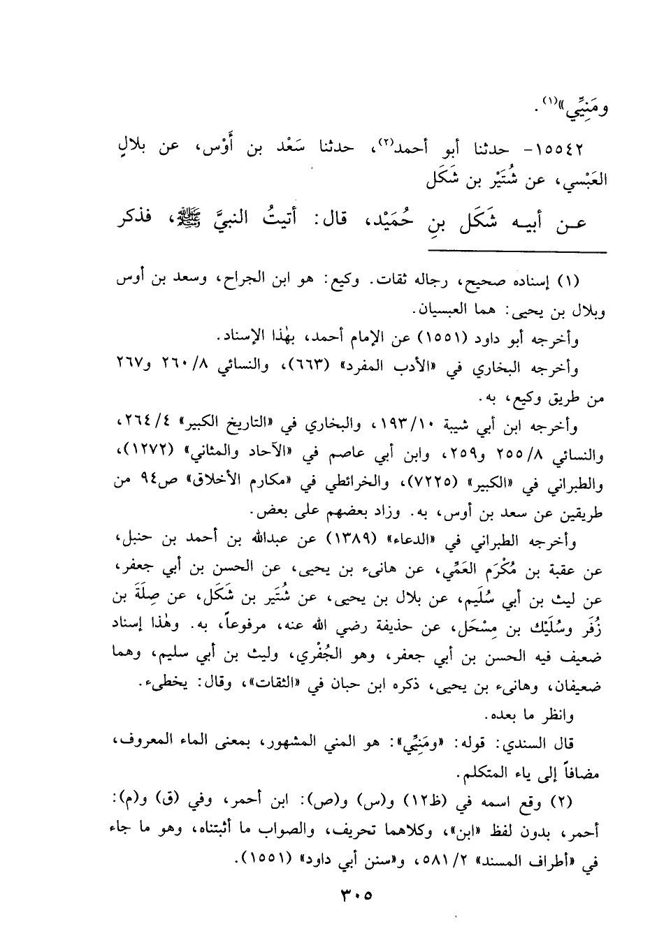 ١٥٥٤٢ - حَدَّثَنَا أَبُو أَحْمَدَ (٢) ، حَدَّثَنَا سَعْدُ بْنُ أَوْسٍ، عَنْ بِلَالٍ الْعَبْسِيِّ، عَنْ شُتَيْرِ بْنِ شَكَلٍ، عَنْ أَبِيهِ شَكَلِ بْنِ حُمَيْدٍ، قَالَ: أَتَيْتُ النَّبِيَّ صَلَّى اللهُ عَلَيْهِ وَسَلَّمَ، فَذَكَرَ
