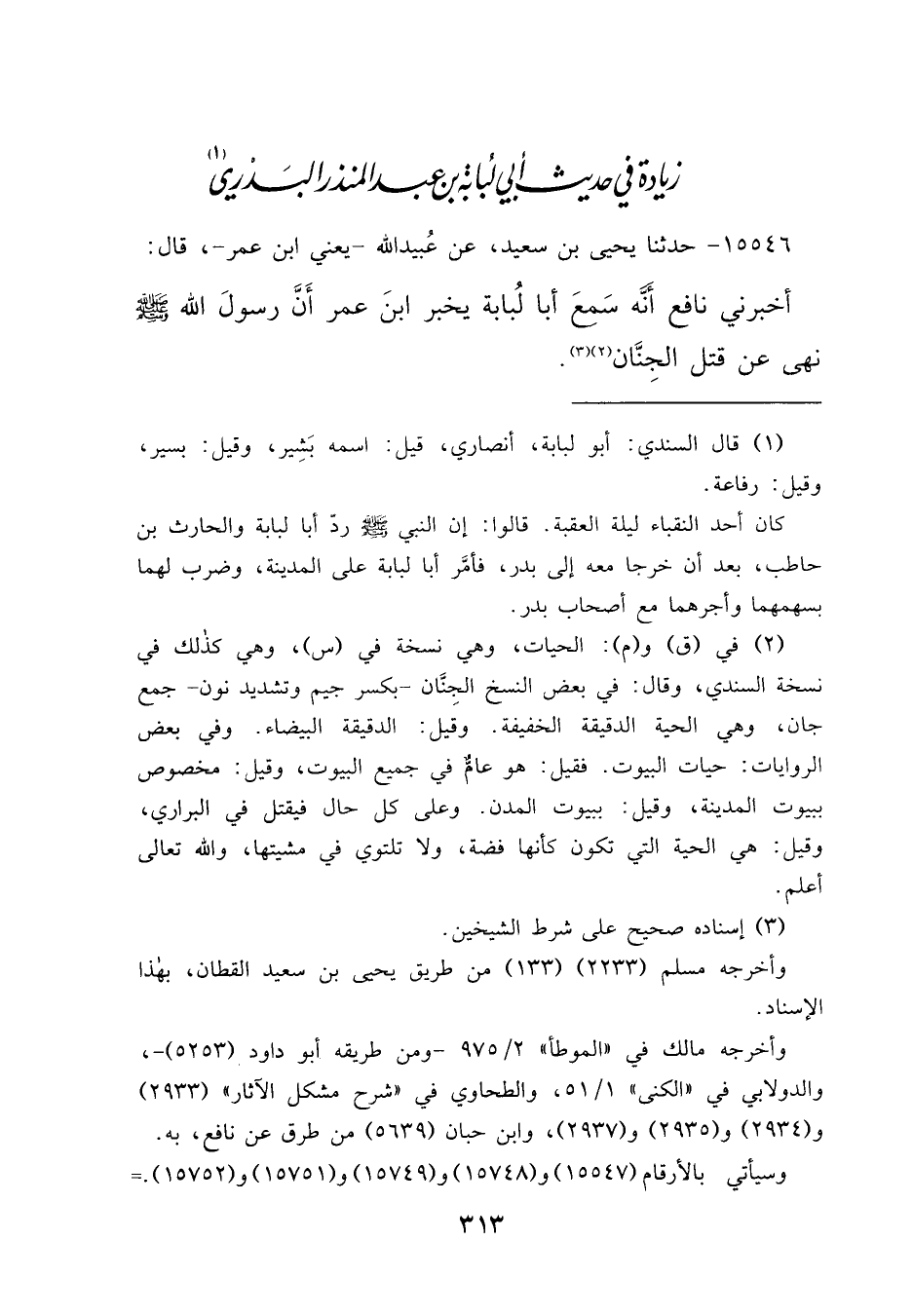 ١٥٥٤٦ - حَدَّثَنَا يَحْيَى بْنُ سَعِيدٍ، عَنْ عُبَيْدِ اللهِ يَعْنِي ابْنَ عُمَرَ، قَالَ: أَخْبَرَنِي نَافِعٌ، أَنَّهُ سَمِعَ أَبَا لُبَابَةَ، يُخْبِرُ ابْنَ عُمَرَ: " أَنَّ رَسُولَ اللهِ صَلَّى اللهُ عَلَيْهِ وَسَلَّمَ نَهَى عَنْ قَتْلِ الْحَيَّاتِ (٢) " (٣)