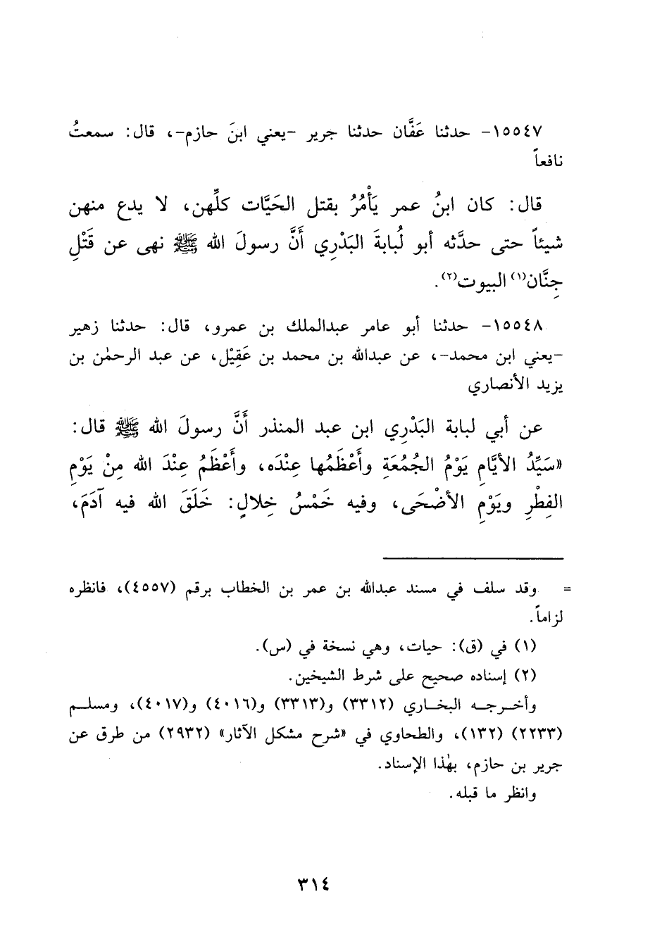 ١٥٥٤٧ - حَدَّثَنَا عَفَّانُ، حَدَّثَنَا جَرِيرٌ يَعْنِي ابْنَ حَازِمٍ، قَالَ: سَمِعْتُ نَافِعًا، قَالَ: كَانَ ابْنُ عُمَرَ يَأْمُرُ بِقَتْلِ الْحَيَّاتِ كُلِّهِنَّ، لَا يَدَعُ مِنْهُنَّ شَيْئًا حَتَّى حَدَّثَهُ أَبُو لُبَابَةَ الْبَدْرِيُّ: " أَنَّ رَسُولَ اللهِ صَلَّى اللهُ عَلَيْهِ وَسَلَّمَ نَهَى عَنْ قَتْلِ جِنَّانِ (١) الْبُيُوتِ " (٢)