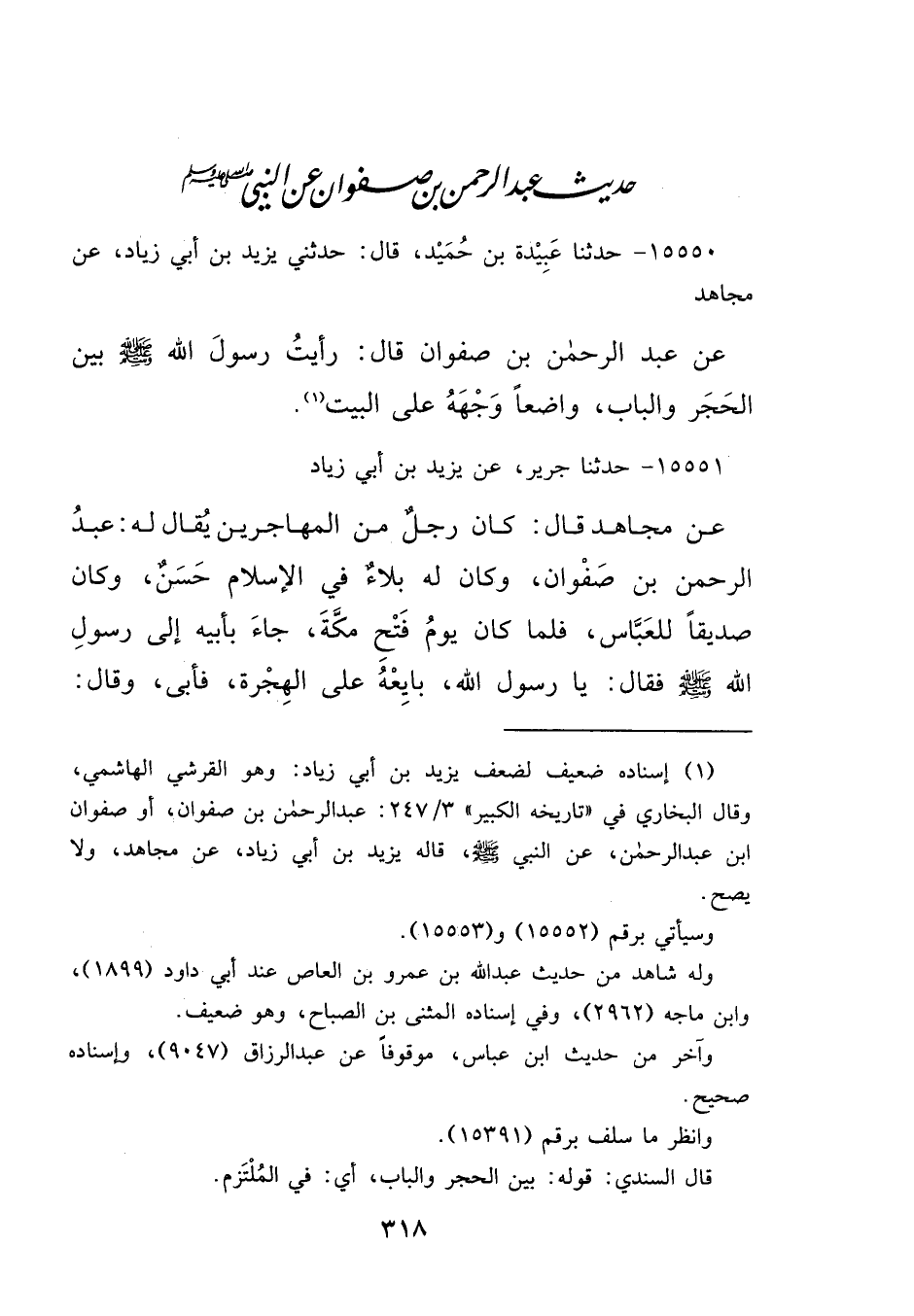 ١٥٥٥٠ - حَدَّثَنَا عَبِيدَةُ بْنُ حُمَيْدٍ، قَالَ: حَدَّثَنِي يَزِيدُ بْنُ أَبِي زِيَادٍ، عَنْ مُجَاهِدٍ، عَنْ عَبْدِ الرَّحْمَنِ بْنِ صَفْوَانَ، قَالَ: " رَأَيْتُ رَسُولَ اللهِ صَلَّى اللهُ عَلَيْهِ وَسَلَّمَ بَيْنَ الْحَجَرِ، وَالْبَابِ وَاضِعًا وَجْهَهُ عَلَى الْبَيْتِ " (١)