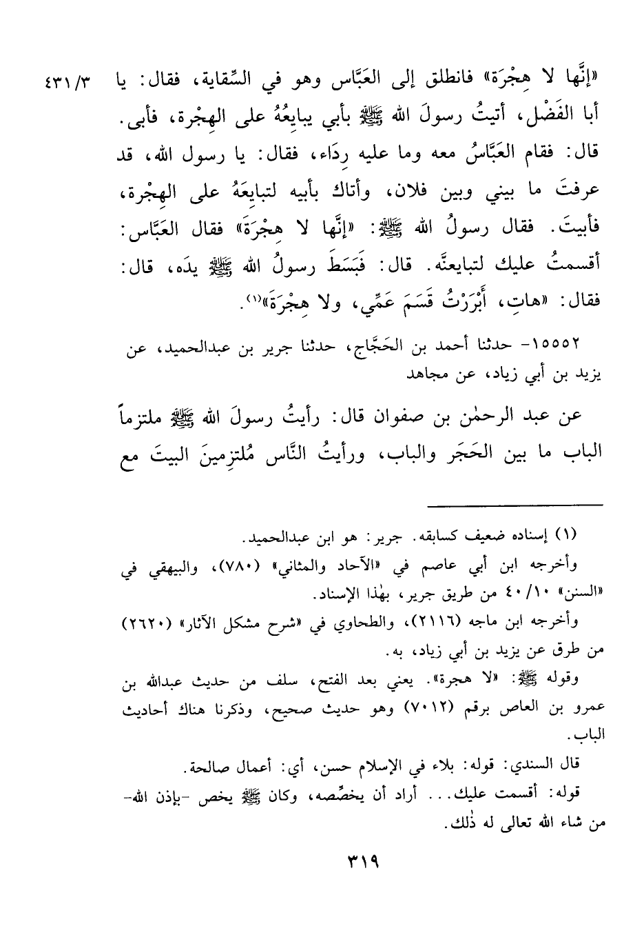 إِنَّهَا لَا هِجْرَةَ " فَانْطَلَقَ إِلَى الْعَبَّاسِ وَهُوَ فِي السِّقَايَةِ، فَقَالَ: يَا أَبَا الْفَضْلِ، أَتَيْتُ رَسُولَ اللهِ صَلَّى اللهُ عَلَيْهِ وَسَلَّمَ بِأَبِي يُبَايِعُهُ عَلَى الْهِجْرَةِ فَأَبَى، قَالَ: فَقَامَ الْعَبَّاسُ مَعَهُ، وَمَا عَلَيْهِ رِدَاءٌ، فَقَالَ: يَا رَسُولَ اللهِ، قَدْ عَرَفْتَ مَا بَيْنِي وَبَيْنَ فُلَانٍ، وَأَتَاكَ بِأَبِيهِ لِتُبَايِعَهُ عَلَى الْهِجْرَةِ، فَأَبَيْتَ، فَقَالَ رَسُولُ اللهِ صَلَّى اللهُ عَلَيْهِ وَسَلَّمَ: " إِنَّهَا لَا هِجْرَةَ " (١) فَقَالَ الْعَبَّاسُ: أَقْسَمْتُ عَلَيْكَ لَتُبَايِعَنَّهُ، قَالَ: فَبَسَطَ رَسُولُ اللهِ صَلَّى اللهُ عَلَيْهِ وَسَلَّمَ يَدَهُ، قَالَ: فَقَالَ: " هَاتِ أَبْرَرْتُ قَسَمَ عَمِّي، وَلَا هِجْرَةَ "