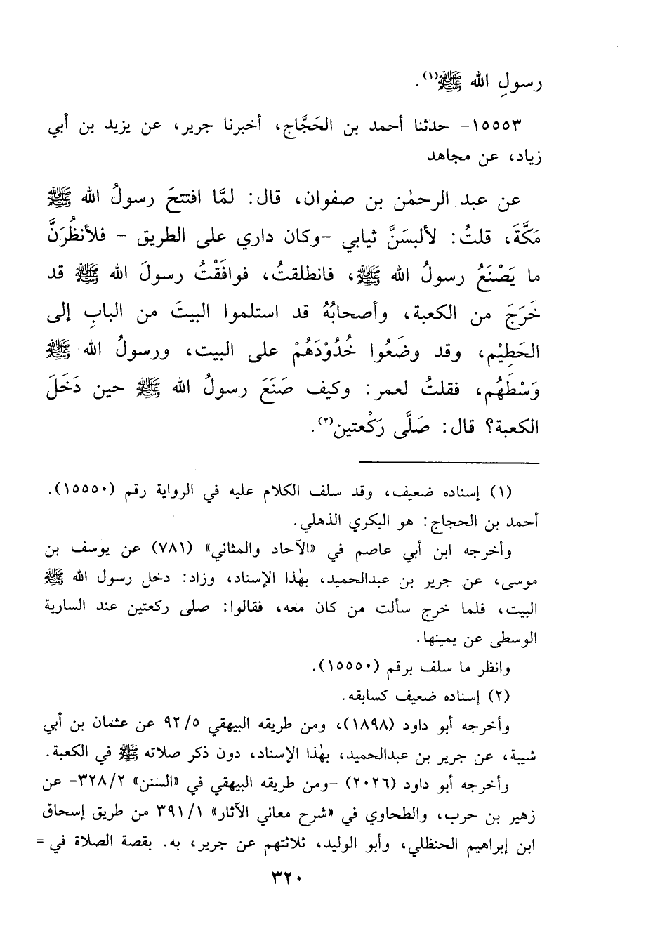 ١٥٥٥٣ - حَدَّثَنَا أَحْمَدُ بْنُ الْحَجَّاجِ، أَخْبَرَنَا جَرِيرٌ، عَنْ يَزِيدَ بْنِ أَبِي زِيَادٍ، عَنْ مُجَاهِدٍ، عَنْ عَبْدِ الرَّحْمَنِ بْنِ صَفْوَانَ، قَالَ: لَمَّا افْتَتَحَ رَسُولُ اللهِ صَلَّى اللهُ عَلَيْهِ وَسَلَّمَ مَكَّةَ، قُلْتُ: لَأَلْبَسَنَّ ثِيَابِي، وَكَانَ دَارِي عَلَى الطَّرِيقِ، فَلَأَنْظُرَنَّ مَا يَصْنَعُ رَسُولُ اللهِ صَلَّى اللهُ عَلَيْهِ وَسَلَّمَ، فَانْطَلَقْتُ، فَوَافَقْتُ رَسُولَ اللهِ صَلَّى اللهُ عَلَيْهِ وَسَلَّمَ قَدْ خَرَجَ مِنَ الْكَعْبَةِ، وَأَصْحَابُهُ قَدِ اسْتَلَمُوا الْبَيْتَ مِنَ الْبَابِ إِلَى الْحَطِيمِ، وَقَدْ وَضَعُوا خُدُودَهُمْ عَلَى الْبَيْتِ، وَرَسُولُ اللهِ صَلَّى اللهُ عَلَيْهِ وَسَلَّمَ، وَسْطَهُمْ فَقُلْتُ لِعُمَرَ: وكَيْفَ صَنَعَ رَسُولُ اللهِ صَلَّى اللهُ عَلَيْهِ وَسَلَّمَ حِينَ دَخَلَ الْكَعْبَةَ؟ قَالَ: " صَلَّى رَكْعَتَيْنِ " (٢)