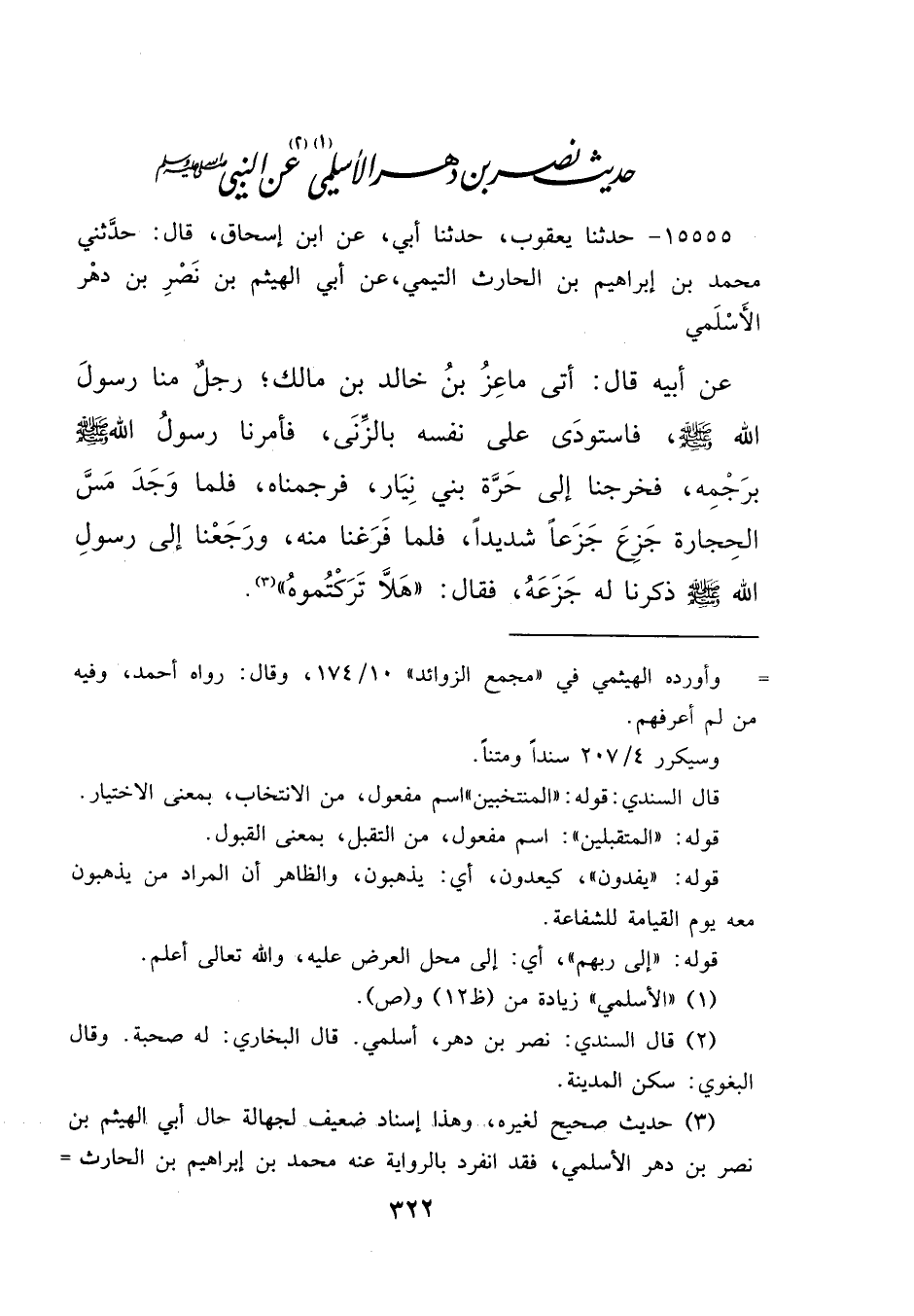 ١٥٥٥٥ - حَدَّثَنَا يَعْقُوبُ، حَدَّثَنَا أَبِي، عَنِ ابْنِ إِسْحَاقَ، قَالَ: حَدَّثَنِي مُحَمَّدُ بْنُ إِبْرَاهِيمَ بْنِ الْحَارِثِ التَّيْمِيِّ، عَنْ أَبِي الْهَيْثَمِ بْنِ نَصْرِ بْنِ دَهْرٍ الْأَسْلَمِيِّ، عَنْ أَبِيهِ، قَالَ: أَتَى مَاعِزُ بْنُ خَالِدِ بْنِ مَالِكٍ - رَجُلٌ مِنَّا - رَسُولَ اللهِ صَلَّى اللهُ عَلَيْهِ وَسَلَّمَ، فَاسْتَوْدَى عَلَى نَفْسِهِ بِالزِّنَا، " فَأَمَرَنَا رَسُولُ اللهِ صَلَّى اللهُ عَلَيْهِ وَسَلَّمَ بِرَجْمِهِ " فَخَرَجْنَا إِلَى حَرَّةِ بَنِي نِيَارٍ، فَرَجَمْنَاهُ فَلَمَّا وَجَدَ مَسَّ الْحِجَارَةِ جَزِعَ جَزَعًا شَدِيدًا، فَلَمَّا فَرَغْنَا مِنْهُ، وَرَجَعْنَا إِلَى رَسُولِ اللهِ صَلَّى اللهُ عَلَيْهِ وَسَلَّمَ، ذَكَرْنَا لَهُ جَزَعَهُ فَقَالَ: " هَلَّا تَرَكْتُمُوهُ " (٣)