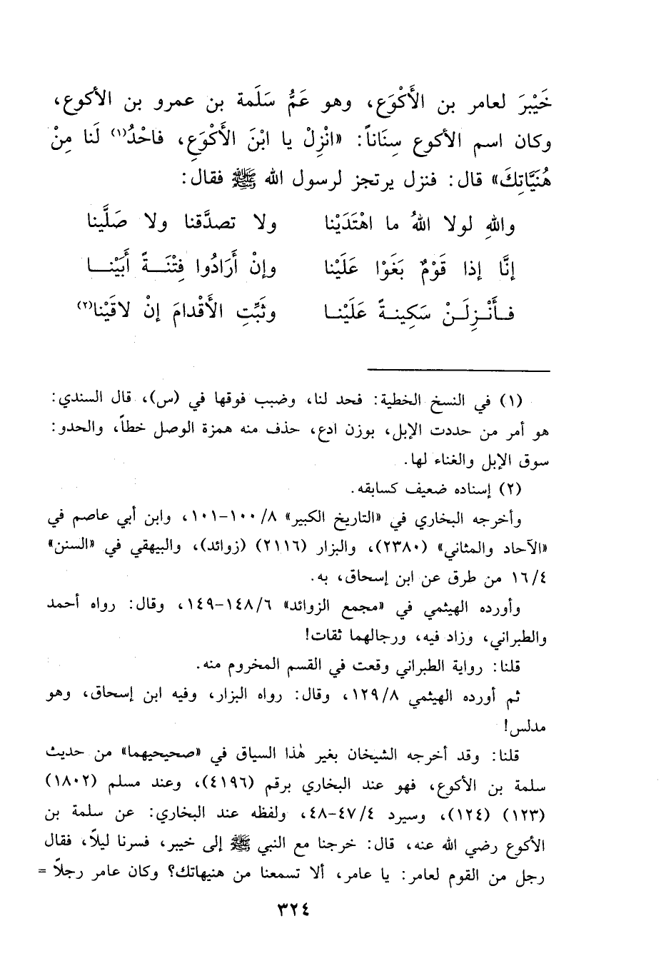 فَأَنْزِلَنْ سَكِينَةً عَلَيْنَا ... وَثَبِّتِ الْأَقْدَامَ إِنْ لَاقَيْنَا " (٢)