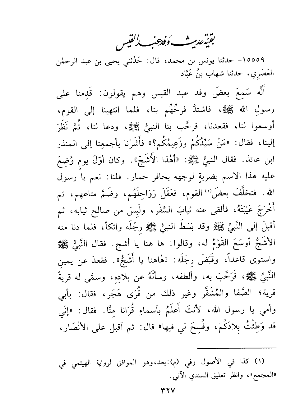 ١٥٥٥٩ - حَدَّثَنَا يُونُسُ بْنُ مُحَمَّدٍ، قَالَ: حَدَّثَنِي يَحْيَى بْنُ عَبْدِ الرَّحْمَنِ الْعَصْرِيُّ، حَدَّثَنَا شِهَابُ بْنُ عَبَّادٍ، أَنَّهُ سَمِعَ بَعْضَ وَفْدِ عَبْدِ الْقَيْسِ وَهُمْ يَقُولُونَ: قَدِمْنَا عَلَى رَسُولِ اللهِ صَلَّى اللهُ عَلَيْهِ وَسَلَّمَ فَاشْتَدَّ فَرَحُهُمْ بِنَا، فَلَمَّا انْتَهَيْنَا إِلَى الْقَوْمِ أَوْسَعُوا لَنَا، فَقَعَدْنَا فَرَحَّبَ بِنَا النَّبِيُّ صَلَّى اللهُ عَلَيْهِ وَسَلَّمَ، وَدَعَا لَنَا، ثُمَّ نَظَرَ إِلَيْنَا فَقَالَ: " مَنْ سَيِّدُكُمْ وَزَعِيمُكُمْ؟ " فَأَشَرْنَا بِأَجْمَعِنَا إِلَى الْمُنْذِرِ بْنِ عَائِذٍ، فَقَالَ النَّبِيُّ صَلَّى اللهُ عَلَيْهِ وَسَلَّمَ: " أَهَذَا الْأَشَجُّ " وَكَانَ أَوَّلَ يَوْمٍ وُضِعَ عَلَيْهِ هَذَا الِاسْمُ بِضَرْبَةٍ لِوَجْهِهِ بِحَافِرِ حِمَارٍ، قُلْنَا: نَعَمْ. يَا رَسُولَ اللهِ، فَتَخَلَّفَ بَعْضُ (١) الْقَوْمِ، فَعَقَلَ رَوَاحِلَهُمْ، وَضَمَّ مَتَاعَهُمْ، ثُمَّ أَخْرَجَ عَيْبَتَهُ فَأَلْقَى عَنْهُ ثِيَابَ السَّفَرِ، وَلَبِسَ مِنْ صَالِحِ ثِيَابِهِ، ثُمَّ أَقْبَلَ إِلَى النَّبِيِّ صَلَّى اللهُ عَلَيْهِ وَسَلَّمَ، وَقَدْ بَسَطَ النَّبِيُّ صَلَّى اللهُ عَلَيْهِ وَسَلَّمَ رِجْلَهُ، وَاتَّكَأَ، فَلَمَّا دَنَا مِنْهُ الْأَشَجُّ أَوْسَعَ الْقَوْمُ لَهُ، وَقَالُوا: هَاهُنَا يَا أَشَجُّ، فَقَالَ النَّبِيُّ صَلَّى اللهُ عَلَيْهِ وَسَلَّمَ وَاسْتَوَى قَاعِدًا، وَقَبَضَ رِجْلَهُ: " هَاهُنَا يَا أَشَجُّ " فَقَعَدَ عَنْ يَمِينِ النَّبِيِّ صَلَّى اللهُ عَلَيْهِ وَسَلَّمَ فَرَحَّبَ بِهِ، وَأَلْطَفَهُ، وَسَأَلَهُ عَنْ بِلَادِهِ وَسَمَّى لَهُ قَرْيَةً قَرْيَةً الصَّفَا، وَالْمُشَقَّرَ وَغَيْرَ ذَلِكَ مِنْ قُرَى هَجَرَ، فَقَالَ: بِأَبِي وَأُمِّي يَا رَسُولَ اللهِ، لَأَنْتَ أَعْلَمُ بِأَسْمَاءِ قُرَانَا مِنَّا، فَقَالَ: إِنِّي قَدْ وَطِئْتُ بِلَادَكُمْ، وَفُسِحَ لِي فِيهَا، قَالَ: ثُمَّ أَقْبَلَ عَلَى الْأَنْصَارِ