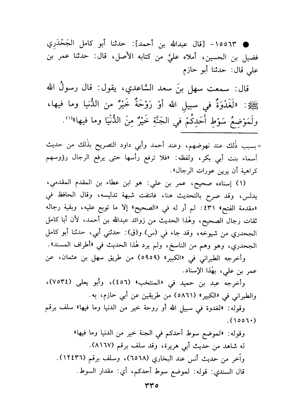 ١٥٥٦٣ - قَالَ عَبْدُ اللهِ بْنُ أَحْمَدَ: حَدَّثَنَا أَبُو كَامِلٍ الْجَحْدَرِيُّ فُضَيْلُ بْنُ الْحُسَيْنِ - أَمْلَاهُ عَلَيَّ مِنْ كِتَابِهِ الْأَصْلِ - قَالَ: حَدَّثَنَا عُمَرُ بْنُ عَلِيٍّ، قَالَ: حَدَّثَنَا أَبُو حَازِمٍ، قَالَ: سَمِعْتُ سَهْلَ بْنَ سَعْدٍ السَّاعِدِيَّ، يَقُولُ: قَالَ رَسُولُ اللهِ صَلَّى اللهُ عَلَيْهِ وَسَلَّمَ: " لَغَدْوَةٌ فِي سَبِيلِ اللهِ - أَوْ رَوْحَةٌ - خَيْرٌ مِنَ الدُّنْيَا وَمَا فِيهَا، وَلَمَوْضِعُ سَوْطِ أَحَدِكُمْ فِي الْجَنَّةِ خَيْرٌ مِنَ الدُّنْيَا وَمَا فِيهَا " (١)