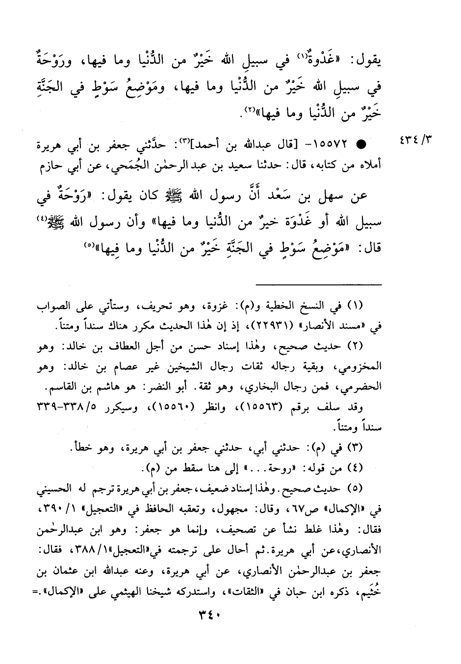• ١٥٥٧٢ - قَالَ عَبْدُ اللهِ بْنُ أَحْمَدَ: (٣) حَدَّثَنِي جَعْفَرُ بْنُ أَبِي هُرَيْرَةَ - أَمْلَاهُ مِنْ كِتَابِهِ - قَالَ: حَدَّثَنَا سَعِيدُ بْنُ عَبْدِ الرَّحْمَنِ الْجُمَحِيُّ، عَنْ أَبِي حَازِمٍ، عَنْ سَهْلِ بْنِ سَعْدٍ، أَنَّ رَسُولَ اللهِ صَلَّى اللهُ عَلَيْهِ وَسَلَّمَ كَانَ يَقُولُ: " رَوْحَةٌ فِي سَبِيلِ اللهِ أَوْ غَدْوَةٌ خَيْرٌ مِنَ الدُّنْيَا وَمَا فِيهَا " وَأَنَّ رَسُولَ اللهِ صَلَّى اللهُ عَلَيْهِ وَسَلَّمَ (٤) قَالَ: " مَوْضِعُ سَوْطٍ فِي الْجَنَّةِ خَيْرٌ مِنَ الدُّنْيَا، وَمَا فِيهَا " (٥)