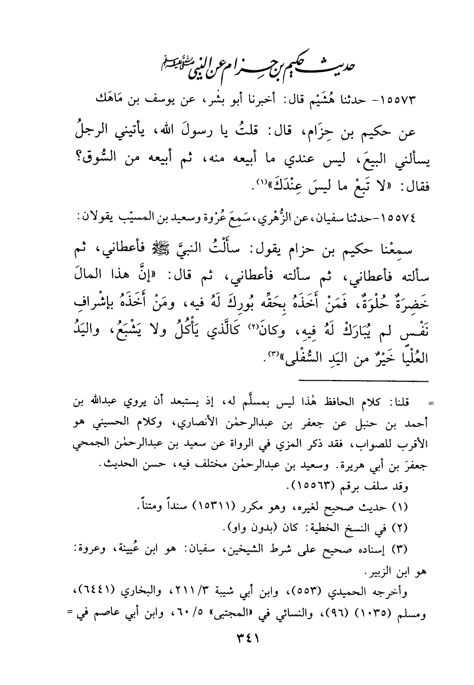 ١٥٥٧٤ - حَدَّثَنَا سُفْيَانُ، عَنِ الزُّهْرِيِّ، سَمِعَ عُرْوَةَ، وَسَعِيدَ بْنَ الْمُسَيِّبِ، يَقُولَانِ: سَمِعْنَا حَكِيمَ بْنَ حِزَامٍ، يَقُولُ: سَأَلْتُ النَّبِيَّ صَلَّى اللهُ عَلَيْهِ وَسَلَّمَ فَأَعْطَانِي، ثُمَّ سَأَلْتُهُ فَأَعْطَانِي، ثُمَّ سَأَلْتُهُ فَأَعْطَانِي ثُمَّ قَالَ: " إِنَّ هَذَا الْمَالَ خَضِرَةٌ حُلْوَةٌ، فَمَنْ أَخَذَهُ بِحَقِّهِ بُورِكَ لَهُ فِيهِ، وَمَنْ أَخَذَهُ بِإِشْرَافِ نَفْسٍ لَمْ يُبَارَكْ لَهُ فِيهِ، وَكَانَ (٢) كَالَّذِي يَأْكُلُ وَلَا يَشْبَعُ، وَالْيَدُ الْعُلْيَا خَيْرٌ مِنَ الْيَدِ السُّفْلَى " (٣)