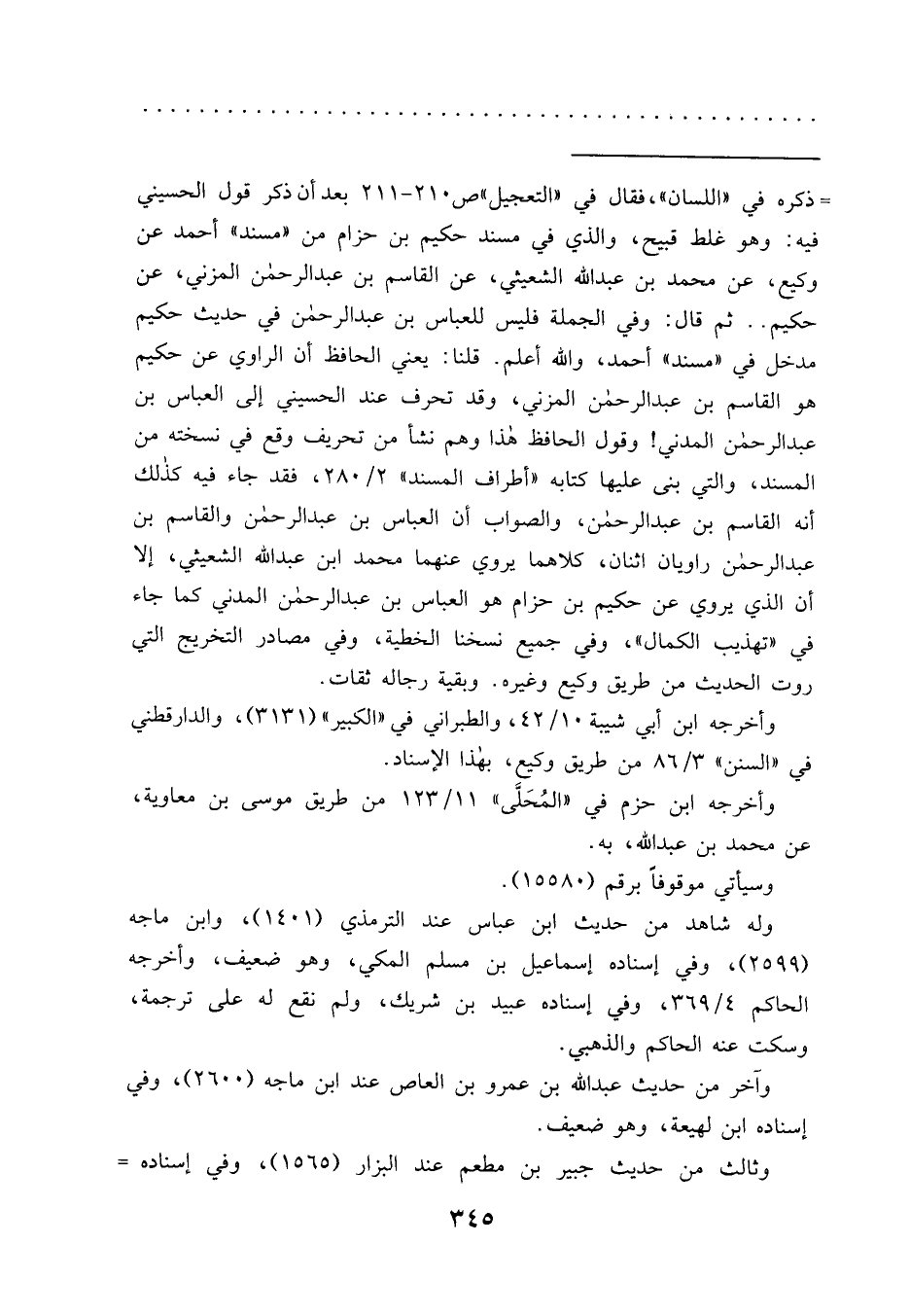 = ذكره في "اللسان"، فقال في "التعجيل" ص ٢١٠-٢١١ بعد أن ذكر قول الحسيني فيه: وهو غلط قبيح، والذي في مسند حكيم بن حزام من "مسند" أحمد عن وكيع، عن محمد بن عبد الله الشعيثي، عن القاسم بن عبد الرحمن المزني، عن حكيم.. ثم قال: وفي الجملة فليس للعباس بن عبد الرحمن في حديث حكيم مدخل في "مسند" أحمد، والله أعلم. قلنا: يعني الحافظ أن الراوي عن حكيم هو القاسم بن عبد الرحمن المزني، وقد تحرف عند الحسيني إلى العباس بن عبد الرحمن المدني! وقول الحافظ هذا وهم نشأ من تحريف وقع في نسخته من المسند، والتي بنى عليها كتابه "أطراف المسند" ٢/٢٨٠، فقد جاء فيه كذلك أنه القاسم بن عبد الرحمن، والصواب أن العباس بن عبد الرحمن والقاسم بن عبد الرحمن راويان اثنان، كلاهما يروي عنهما محمد ابن عبد الله الشعيثي، إلا أن الذي يروي عن حكيم بن حزام هو العباس بن عبد الرحمن المدني كما جاء في "تهذيب الكمال"، وفي جميع نسخنا الخطية، وفي مصادر التخريج التي روت الحديث من طريق وكيع وغيره. وبقية رجاله ثقات.
