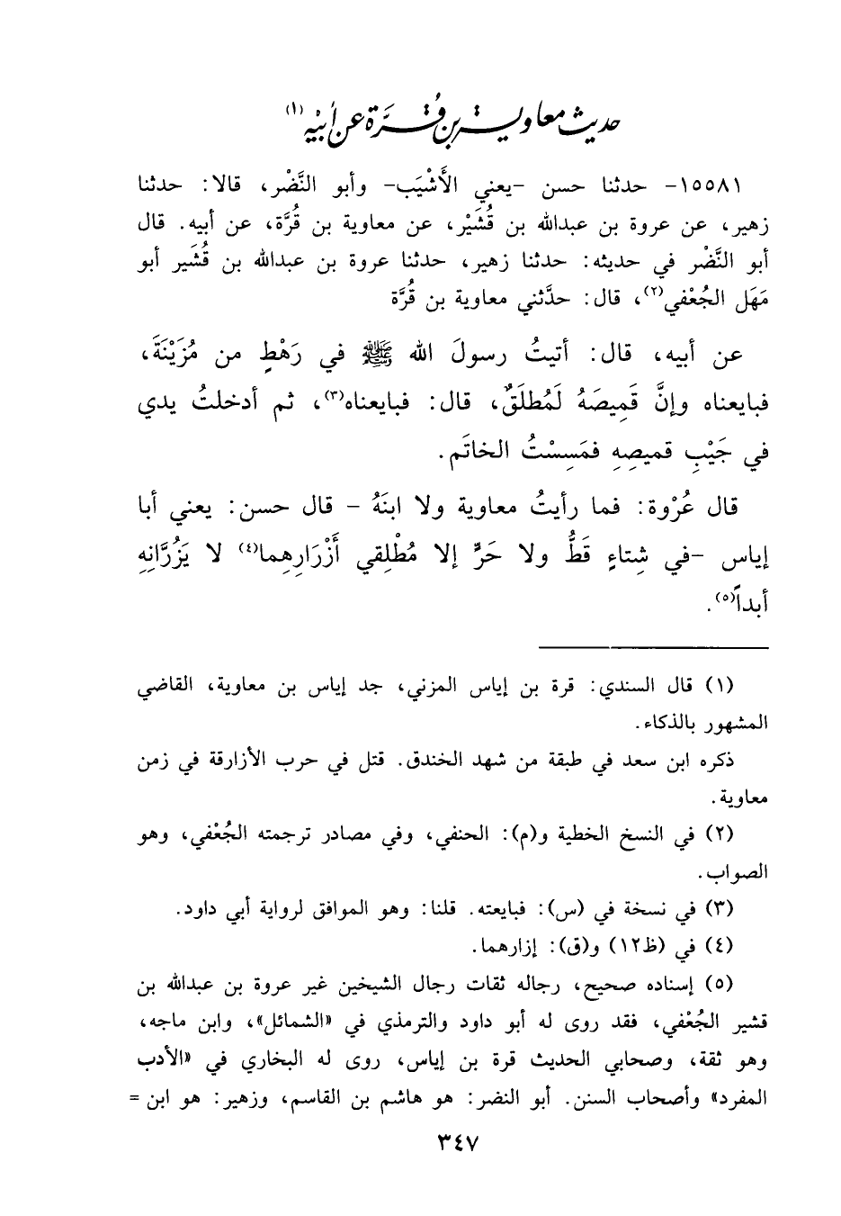 ١٥٥٨١ - حَدَّثَنَا حَسَنٌ يَعْنِي الْأَشْيَبَ، وَأَبُو النَّضْرِ، قَالَا: حَدَّثَنَا زُهَيْرٌ، عَنْ عُرْوَةَ بْنِ عَبْدِ اللهِ بْنِ قُشَيْرٍ، عَنْ مُعَاوِيَةَ بْنِ قُرَّةَ، عَنْ أَبِيهِ، قَالَ أَبُو النَّضْرِ فِي حَدِيثِهِ: حَدَّثَنَا زُهَيْرٌ، حَدَّثَنَا عُرْوَةُ بْنُ عَبْدِ اللهِ بْنِ قُشَيْرٍ أَبُو مَهَلٍ الْجُعْفِيّ، (٢) قَالَ: حَدَّثَنِي مُعَاوِيَةُ بْنُ قُرَّةَ، عَنْ أَبِيهِ، قَالَ: " أَتَيْتُ رَسُولَ اللهِ صَلَّى اللهُ عَلَيْهِ وَسَلَّمَ فِي رَهْطٍ مِنْ مُزَيْنَةَ فَبَايَعْنَاهُ، وَإِنَّ قَمِيصَهُ لَمُطْلَقٌ "، قَالَ: " فَبَايَعْنَاهُ، (٣) ثُمَّ أَدْخَلْتُ يَدِي فِي جَيْبِ قَمِيصِهِ فَمَسِسْتُ الْخَاتَمَ " قَالَ عُرْوَةُ: " فَمَا رَأَيْتُ مُعَاوِيَةَ وَلَا ابْنَهُ - قَالَ حَسَنٌ: يَعْنِي أَبَا إِيَاسٍ - فِي شِتَاءٍ قَطُّ، وَلَا حَرٍّ إِلَّا مُطْلِقَيْ أزْرَارِهِمَا (٤) لَا يَزُرَّانِهِ أَبَدًا " (٥)