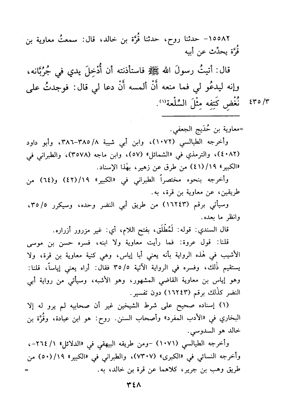 قلنا: قول عروة: فما رأيت معاوية ولا ابنه، فسره حسن بن موسى الأشيب في هذه الرواية بأنه يعني أبا إياس، وهي كنية معاوية بن قرة، ولا يستقيم ذلك، وفسره في الرواية الآتية ٥/٣٥ فقال: أراه يعني إياساً، قلنا: وهو أياس بن معاوية القاضي المشهور، وهو الأشبه، وسيأتي من رواية أبي