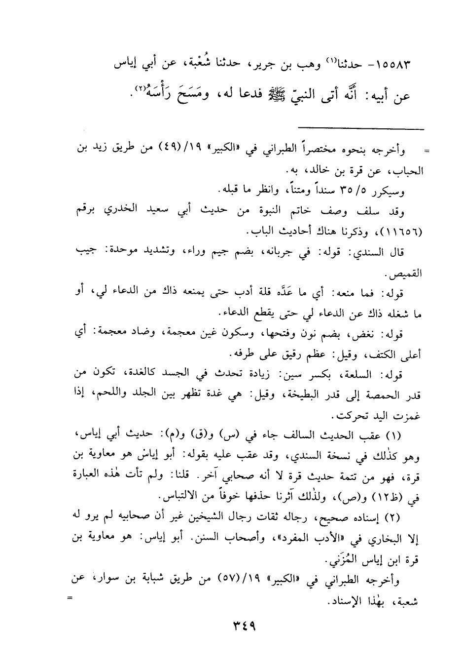 ١٥٥٨٣ - حَدَّثَنَا (١) وَهْبُ بْنُ جَرِيرٍ، حَدَّثَنَا شُعْبَةُ، عَنْ أَبِي إِيَاسٍ، عَنْ أَبِيهِ، أَنَّهُ " أَتَى النَّبِيَّ صَلَّى اللهُ عَلَيْهِ وَسَلَّمَ فَدَعَا لَهُ وَمَسَحَ رَأْسَهُ " (٢)