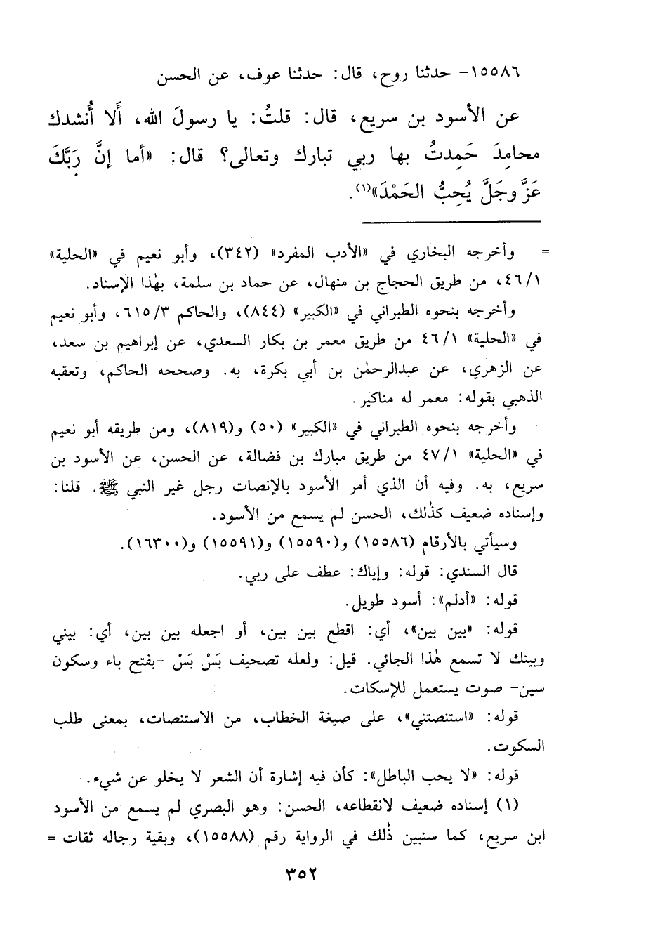 ١٥٥٨٦ - حَدَّثَنَا رَوْحٌ، قَالَ: حَدَّثَنَا عَوْفٌ، عَنِ الْحَسَنِ، عَنْ الْأَسْوَدِ بْنِ سَرِيعٍ، قَالَ: قُلْتُ: يَا رَسُولَ اللهِ، أَلَا أُنْشِدُكَ مَحَامِدَ حَمِدْتُ بِهَا رَبِّي تَبَارَكَ وَتَعَالَى؟ قَالَ: " أَمَا إِنَّ رَبَّكَ عَزَّ وَجَلَّ يُحِبُّ الْحَمْدَ " (١)