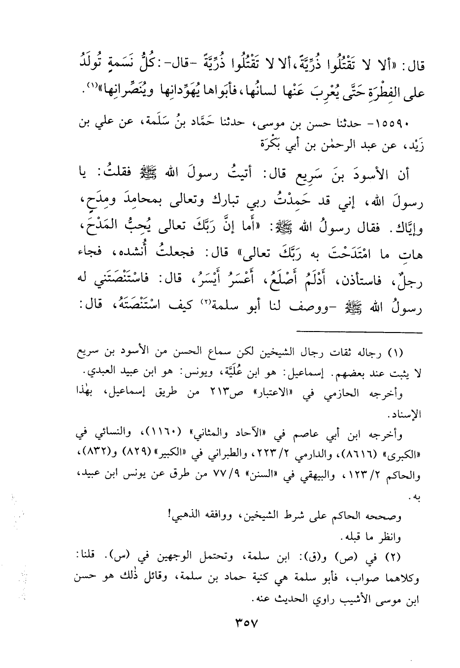 (٢) في (ص) و (ق) : ابن سلمة، وتحتمل الوجهين في (س) . قلنا: وكلاهما صواب، فأبو سلمة هي كنية حماد بن سلمة، وقائل ذلك هو حسن ابن موسى الأشيب راوي الحديث عنه.