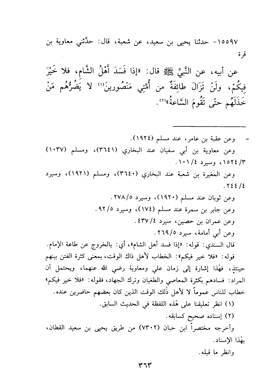 ١٥٥٩٧ - حَدَّثَنَا يَحْيَى بْنُ سَعِيدٍ، عَنْ شُعْبَةَ، قَالَ: حَدَّثَنِي مُعَاوِيَةُ بْنُ قُرَّةَ، عَنْ أَبِيهِ، عَنِ النَّبِيِّ صَلَّى اللهُ عَلَيْهِ وَسَلَّمَ قَالَ: " إِذَا فَسَدَ أَهْلُ الشَّامِ فَلَا خَيْرَ فِيكُمْ، وَلَنْ تَزَالَ طَائِفَةٌ مِنْ أُمَّتِي مَنْصُورِينَ، (١) لَا يَضُرُّهُمْ مَنْ خَذَلَهُمْ حَتَّى تَقُومَ السَّاعَةُ " (٢)