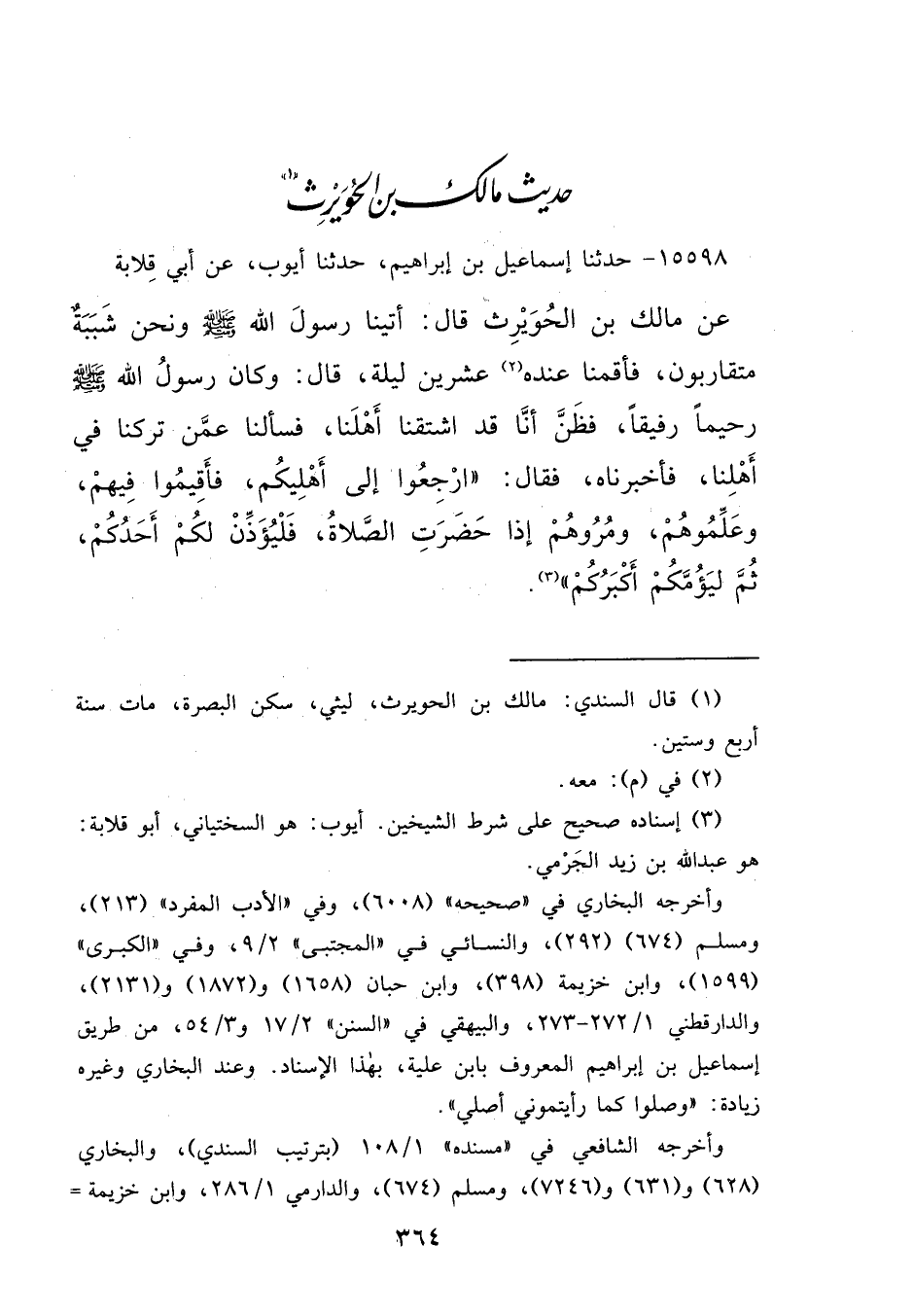 ١٥٥٩٨ - حَدَّثَنَا إِسْمَاعِيلُ بْنُ إِبْرَاهِيمَ، حَدَّثَنَا أَيُّوبُ، عَنْ أَبِي قِلَابَةَ، عَنْ مَالِكِ بْنِ الْحُوَيْرِثِ، قَالَ: أَتَيْنَا رَسُولَ اللهِ صَلَّى اللهُ عَلَيْهِ وَسَلَّمَ، وَنَحْنُ شَبَبَةٌ مُتَقَارِبُونَ، فَأَقَمْنَا عِنْدَهُ (٢) عِشْرِينَ لَيْلَةً، قَالَ: وَكَانَ رَسُولُ اللهِ صَلَّى اللهُ عَلَيْهِ وَسَلَّمَ رَحِيمًا رَفِيقًا، فَظَنَّ أَنَّا قَدِ اشْتَقْنَا أَهْلَنَا، فَسَأَلَنَا عَمَّنْ تَرَكْنَا فِي أَهْلِنَا، فَأَخْبَرْنَاهُ، فَقَالَ: " ارْجِعُوا إِلَى أَهْلِيكُمْ، فَأَقِيمُوا فِيهِمْ، وَعَلِّمُوهُمْ، وَمُرُوهُمْ إِذَا حَضَرَتِ الصَّلَاةُ، فَلْيُؤَذِّنْ لَكُمْ أَحَدُكُمْ، ثُمَّ لِيَؤُمَّكُمْ أَكْبَرُكُمْ " (٣)