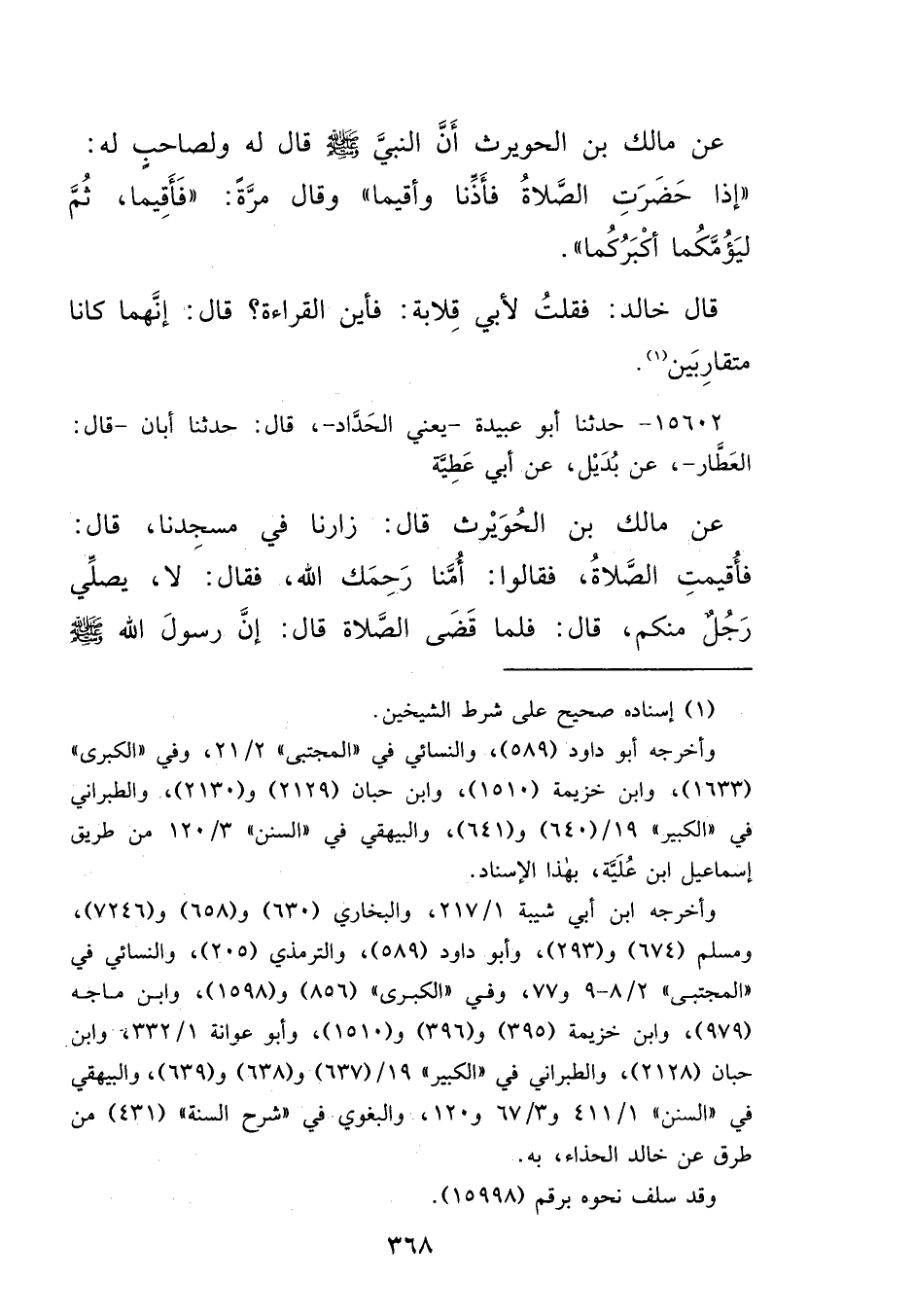 عَنْ مَالِكِ بْنِ الْحُوَيْرِثِ، أَنَّ النَّبِيَّ صَلَّى اللهُ عَلَيْهِ وَسَلَّمَ قَالَ لَهُ، وَلِصَاحِبٍ لَهُ: " إِذَا حَضَرَتِ الصَّلَاةُ فَأَذِّنَا، وَأَقِيمَا " وَقَالَ مَرَّةً: " فَأَقِيمَا ثُمَّ لِيَؤُمَّكُمَا أَكْبَرُكُمَا " قَالَ خَالِدٌ: فَقُلْتُ لِأَبِي قِلَابَةَ: فَأَيْنَ الْقِرَاءَةُ؟ قَالَ: " إِنَّهُمَا كَانَا مُتَقَارِبَيْنِ " (١)