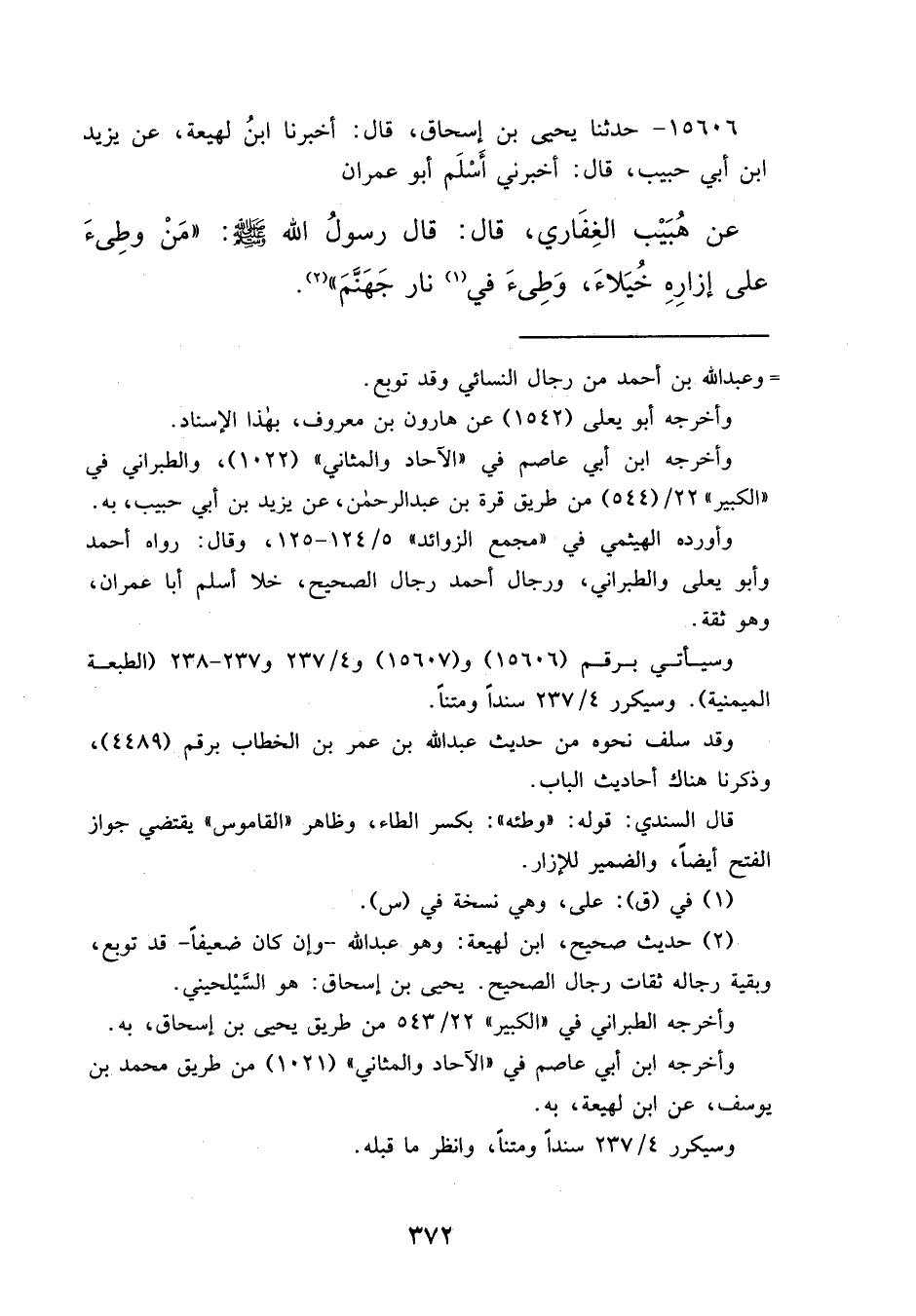 ١٥٦٠٦ - حَدَّثَنَا يَحْيَى بْنُ إِسْحَاقَ، قَالَ: أَخْبَرَنَا ابْنُ لَهِيعَةَ، عَنْ يَزِيدَ بْنِ أَبِي حَبِيبٍ، قَالَ: أَخْبَرَنِي أَسْلَمُ أَبُو عِمْرَانَ، عَنْ هُبَيْبٍ الْغِفَارِيِّ، قَالَ: قَالَ رَسُولُ اللهِ صَلَّى اللهُ عَلَيْهِ وَسَلَّمَ: " مَنْ وَطِئَ عَلَى إِزَارِهِ خُيَلَاءَ وَطِئَ فِي (١) نَارِ جَهَنَّمَ " (٢)