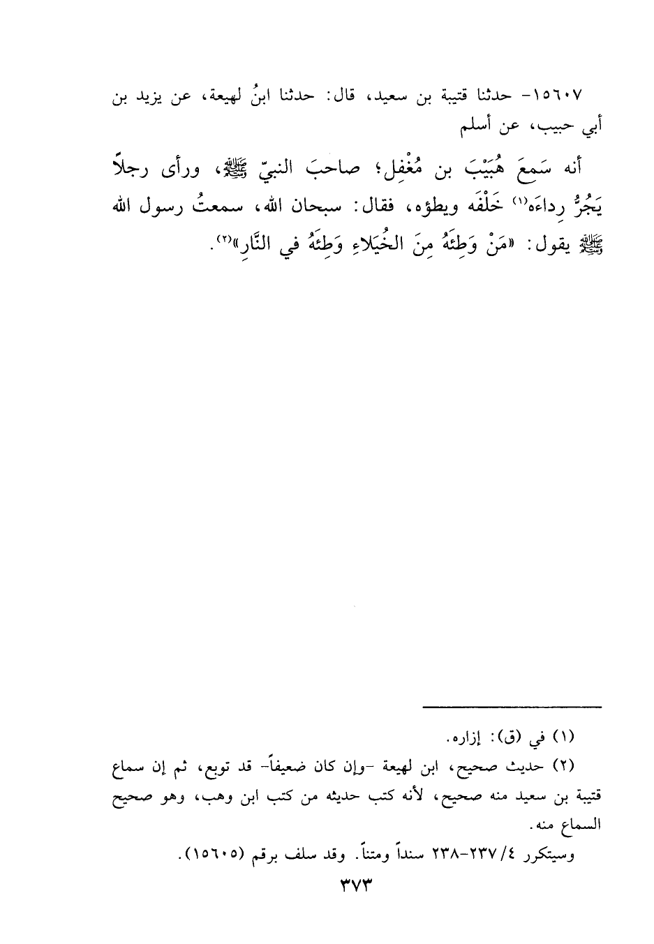 ١٥٦٠٧ - حَدَّثَنَا قُتَيْبَةُ بْنُ سَعِيدٍ، قَالَ: حَدَّثَنَا ابْنُ لَهِيعَةَ، عَنْ يَزِيدَ بْنِ أَبِي حَبِيبٍ، عَنْ أَسْلَمَ، أَنَّهُ سَمِعَ هُبَيْبَ بْنَ مُغْفِلٍ، صَاحِبَ النَّبِيِّ صَلَّى اللهُ عَلَيْهِ وَسَلَّمَ، وَرَأَى رَجُلًا يَجُرُّ رِدَاءَهُ (١) خَلْفَهُ، وَيَطَؤُهُ، فَقَالَ: سُبْحَانَ اللهِ سَمِعْتُ رَسُولَ اللهِ صَلَّى اللهُ عَلَيْهِ وَسَلَّمَ يَقُولُ: " مَنْ وَطِئَهُ مِنَ الْخُيَلَاءِ وَطِئَهُ فِي النَّارِ " (٢)