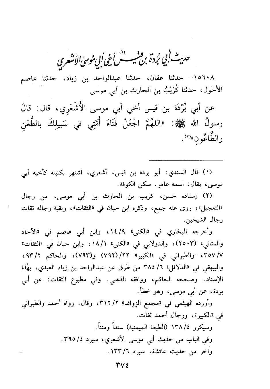 ١٥٦٠٨ - حَدَّثَنَا عَفَّانُ، حَدَّثَنَا عَبْدُ الْوَاحِدِ بْنُ زِيَادٍ، حَدَّثَنَا عَاصِمٌ الْأَحْوَلُ، حَدَّثَنَا كُرَيْبُ بْنُ الْحَارِثِ بْنِ أَبِي مُوسَى، عَنْ أَبِي بُرْدَةَ بْنِ قَيْسٍ، أَخِي أَبِي مُوسَى الْأَشْعَرِيِّ، قَالَ: قَالَ رَسُولُ اللهِ صَلَّى اللهُ عَلَيْهِ وَسَلَّمَ: " اللهُمَّ اجْعَلْ فَنَاءَ أُمَّتِي فِي سَبِيلِكَ بِالطَّعْنِ، وَالطَّاعُونِ " (٢)