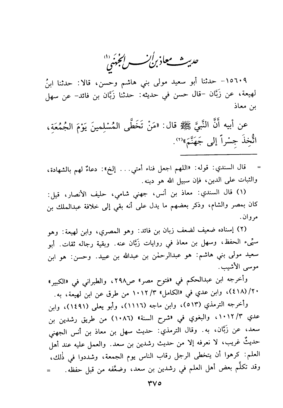 ١٥٦٠٩ - حَدَّثَنَا أَبُو سَعِيدٍ، مَوْلَى بَنِي هَاشِمٍ، وَحَسَنٌ، قَالَا: حَدَّثَنَا ابْنُ لَهِيعَةَ، عَنْ زَبَّانَ، قَالَ حَسَنٌ فِي حَدِيثِهِ: حَدَّثَنَا زَبَّانُ بْنُ فَائِدٍ، عَنْ سَهْلِ بْنِ مُعَاذٍ، عَنْ أَبِيهِ، أَنَّ النَّبِيَّ صَلَّى اللهُ عَلَيْهِ وَسَلَّمَ قَالَ: " مَنْ تَخَطَّى الْمُسْلِمِينَ يَوْمَ الْجُمُعَةِ اتُّخِذَ جِسْرًا إِلَى جَهَنَّمَ " (٢)