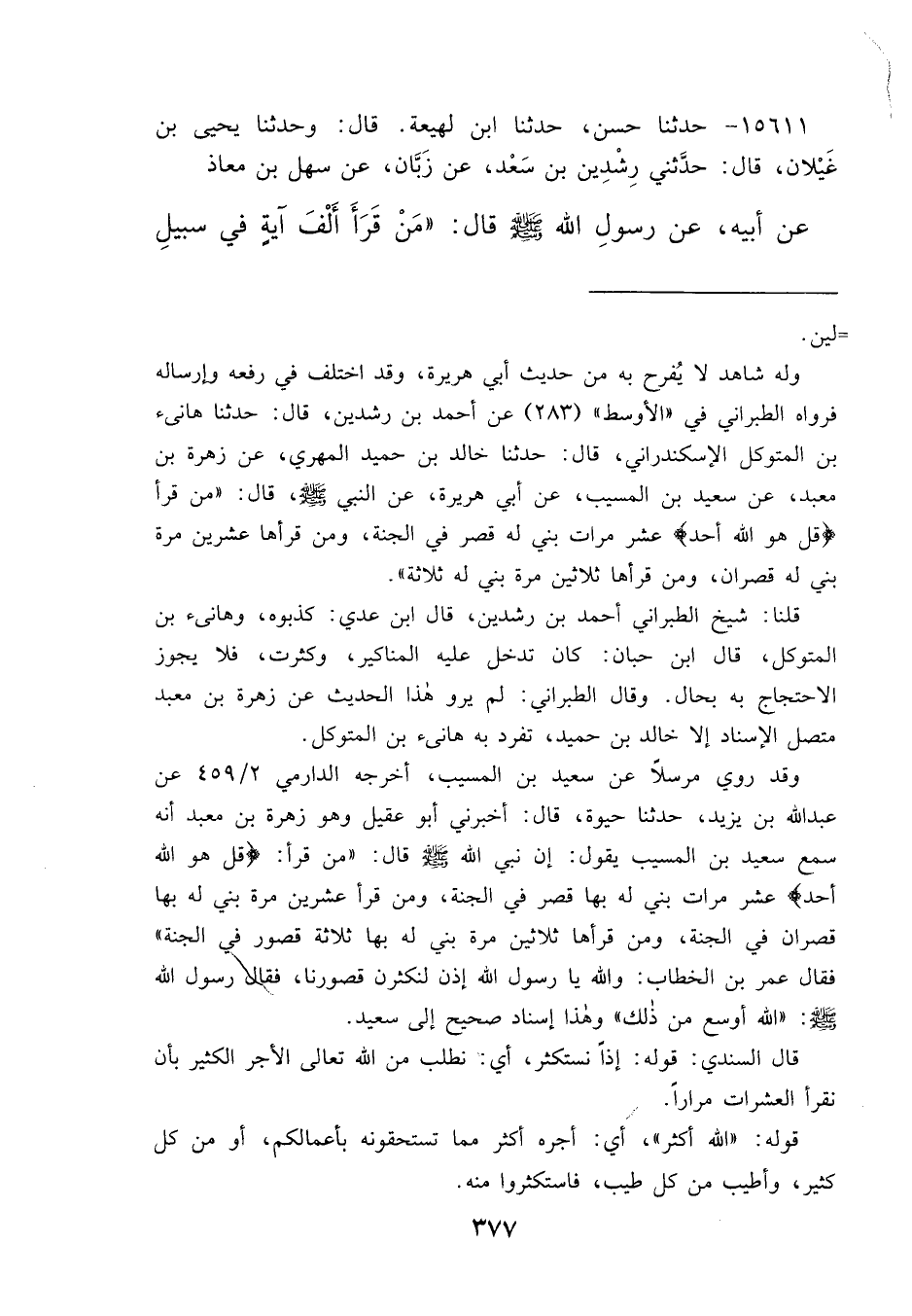 ١٥٦١١ - حَدَّثَنَا حَسَنٌ، حَدَّثَنَا ابْنُ لَهِيعَةَ، قَالَ: وحَدَّثَنَا يَحْيَى بْنُ غَيْلَانَ، قَالَ: حَدَّثَنِي رِشْدِينُ بْنُ سَعْدٍ، عَنْ زَبَّانَ، عَنْ سَهْلِ بْنِ مُعَاذٍ، عَنْ أَبِيهِ، عَنْ رَسُولِ اللهِ صَلَّى اللهُ عَلَيْهِ وَسَلَّمَ قَالَ: " مَنْ قَرَأَ أَلْفَ آيَةٍ فِي سَبِيلِ