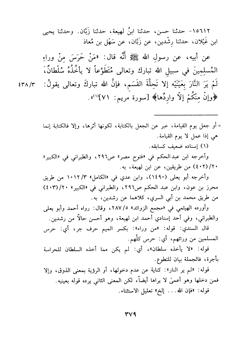 ١٥٦١٢ - حَدَّثَنَا حَسَنٌ، حَدَّثَنَا ابْنُ لَهِيعَةَ، حَدَّثَنَا زَبَّانُ، وَحَدَّثَنَا يَحْيَى بْنُ غَيْلَانَ، حَدَّثَنَا رِشْدِينُ، عَنْ زَبَّانَ، عَنْ سَهْلِ بْنِ مُعَاذٍ، عَنْ أَبِيهِ، عَنْ رَسُولِ اللهِ صَلَّى اللهُ عَلَيْهِ وَسَلَّمَ أَنَّهُ قَالَ: " مَنْ حَرَسَ مِنْ وَرَاءِ الْمُسْلِمِينَ فِي سَبِيلِ اللهِ تَبَارَكَ وَتَعَالَى مُتَطَوِّعًا، لَا يَأْخُذُهُ سُلْطَانٌ، لَمْ يَرَ النَّارَ بِعَيْنَيْهِ، إِلَّا تَحِلَّةَ الْقَسَمِ فَإِنَّ اللهَ تَبَارَكَ وَتَعَالَى يَقُولُ: {وَإِنْ مِنْكُمْ إِلَّا وَارِدُهَا} [مريم: ٧١] (١) "