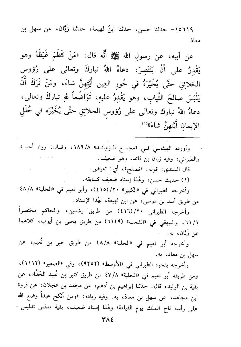 ١٥٦١٩ - حَدَّثَنَا حَسَنٌ، حَدَّثَنَا ابْنُ لَهِيعَةَ، حَدَّثَنَا زَبَّانُ، عَنْ سَهْلِ بْنِ مُعَاذٍ، عَنْ أَبِيهِ، عَنْ رَسُولِ اللهِ صَلَّى اللهُ عَلَيْهِ وَسَلَّمَ أَنَّهُ قَالَ: " مَنْ كَظَمَ غَيْظَهُ، وَهُوَ يَقْدِرُ عَلَى أَنْ يَنْتَصِرَ دَعَاهُ اللهُ تَبَارَكَ وَتَعَالَى عَلَى رُءُوسِ الْخَلَائِقِ، حَتَّى يُخَيِّرَهُ فِي حُورِ الْعِينِ أَيَّتَهُنَّ شَاءَ، وَمَنْ تَرَكَ أَنْ يَلْبَسَ صَالِحَ الثِّيَابِ، وَهُوَ يَقْدِرُ عَلَيْهِ تَوَاضُعًا لِلَّهِ تَبَارَكَ وَتَعَالَى، دَعَاهُ اللهُ تَبَارَكَ وَتَعَالَى عَلَى رُءُوسِ الْخَلَائِقِ حَتَّى يُخَيِّرَهُ اللهُ تَعَالَى فِي حُلَلِ الْإِيمَانِ، أَيَّتَهُنَّ شَاءَ " (١)