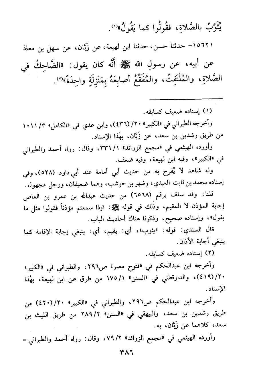 ١٥٦٢١ - حَدَّثَنَا حَسَنٌ، حَدَّثَنَا ابْنُ لَهِيعَةَ، عَنْ زَبَّانَ، عَنْ سَهْلِ بْنِ مُعَاذٍ، عَنْ أَبِيهِ، عَنْ رَسُولِ اللهِ صَلَّى اللهُ عَلَيْهِ وَسَلَّمَ أَنَّهُ كَانَ يَقُولُ: " الضَّاحِكُ فِي الصَّلَاةِ، وَالْمُلْتَفِتُ، وَالْمُفَقِّعُ أَصَابِعَهُ بِمَنْزِلَةٍ وَاحِدَةٍ " (٢)