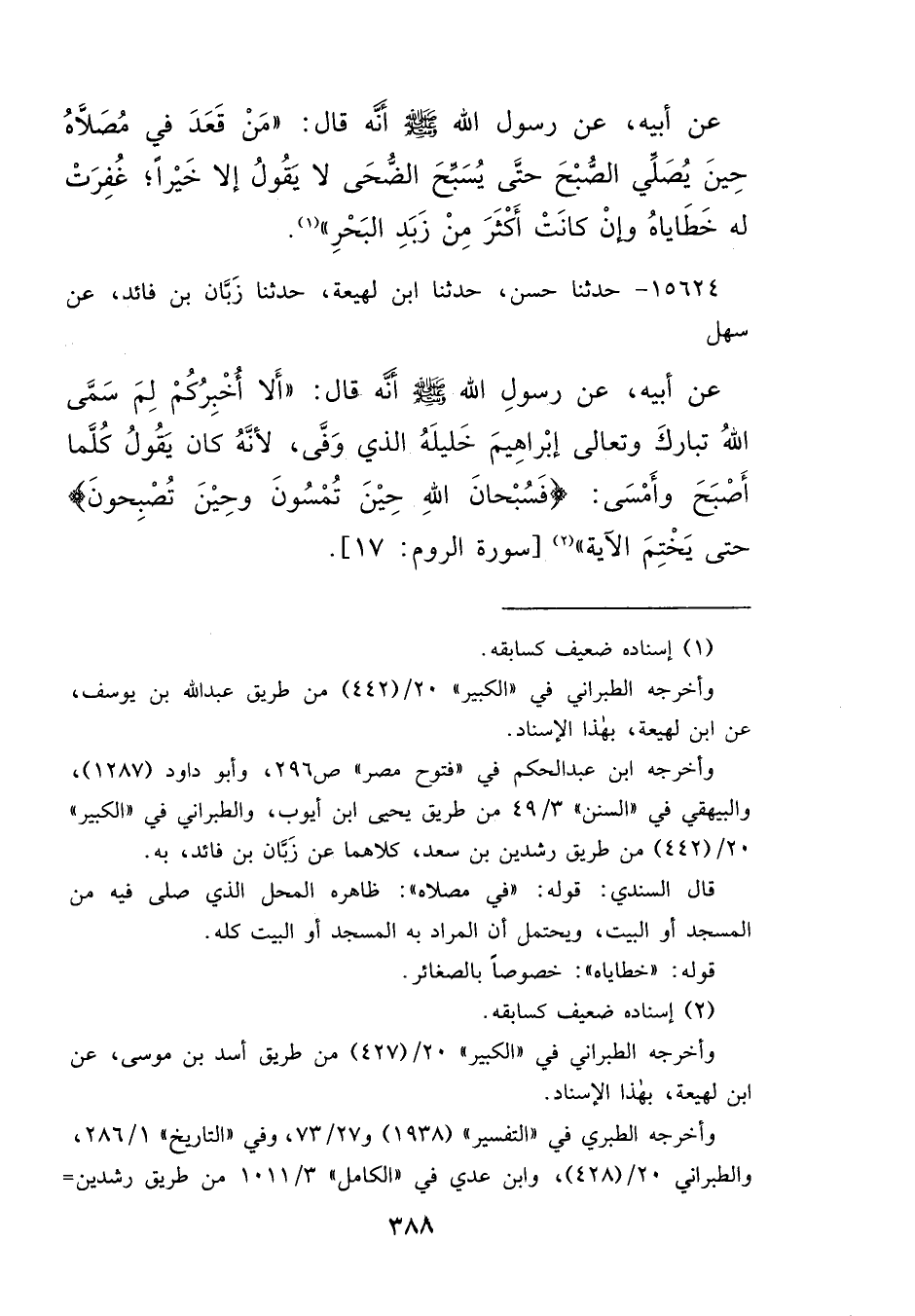 ١٥٦٢٤ - حَدَّثَنَا حَسَنٌ، حَدَّثَنَا ابْنُ لَهِيعَةَ، حَدَّثَنَا زَبَّانُ بْنُ فَائِدٍ، عَنْ سَهْلٍ، عَنْ أَبِيهِ، عَنْ رَسُولِ اللهِ صَلَّى اللهُ عَلَيْهِ وَسَلَّمَ أَنَّهُ قَالَ: " أَلَا أُخْبِرُكُمْ لِمَ سَمَّى اللهُ تَبَارَكَ وَتَعَالَى إِبْرَاهِيمَ خَلِيلَهُ الَّذِي وَفَّى؟ لِأَنَّهُ كَانَ يَقُولُ: كُلَّمَا أَصْبَحَ، وَأَمْسَى: {فَسُبْحَانَ اللهِ حِينَ تُمْسُونَ، وَحِينَ تُصْبِحُونَ} [الروم: ١٧] حَتَّى يَخْتِمَ الْآيَةَ " (٢)